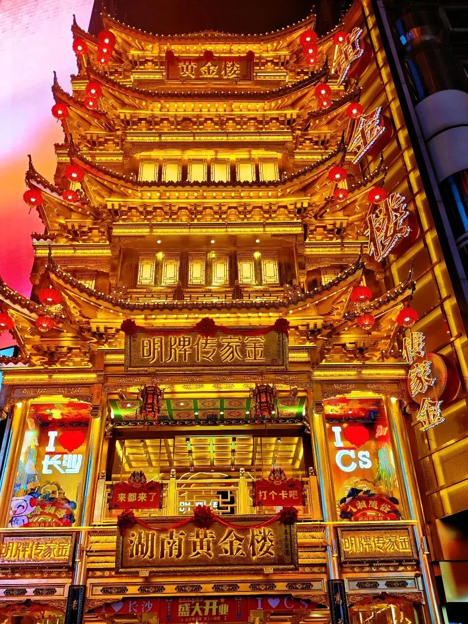 杜甫江阁临江而建,是为了纪念诗圣杜甫而建。建筑风格古色古香,飞檐画栋,气势恢宏,很有唐代建筑的韵味。夜幕降临,长沙才真正展露它的繁华底色,而国金中心,便是整座城市夜景的灵魂所在。452米的高楼刺破夜空,玻璃幕墙被霓虹点亮,与街头的流光溢彩交相辉映。巨型LED屏循环播放着光影画面,裸眼3D效果鲜活灵动,车流与人潮在楼下汇成不息的长河,解放西与五一广场的热闹在此汇聚,从傍晚到凌晨,这里始终涌动着鲜活的都市气息,完美诠释了长沙不夜城的热烈与浪漫。这座城,藏着老街的烟火温情,有着山水的诗意静谧,更有着都市彻夜不息的繁华。每一缕晚风、每一盏灯火、每一份热辣滋味,都构成了独属于长沙的浪漫。不必遗憾时光短暂,那些走过的路、看过的风景,早已成为心底最温暖的回忆。