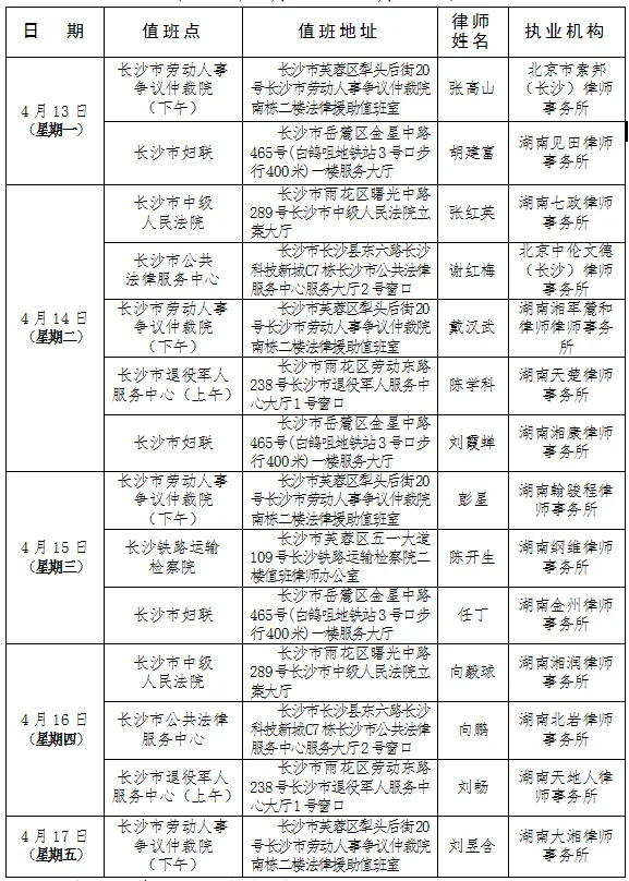 值班安排 | 长沙市法律援助中心驻点律师值班信息(4月13日-4月17日)