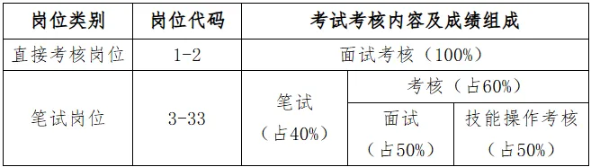 (2)考核总成绩和考核每一单项成绩满分均为100分。按面试成绩占比50%,技能操作考核成绩占比50%合成(总成绩四舍五入后保留两位小数)。设置考核合格分数线70分,考核任一单项成绩低于70分的考生不再进入公开招聘下一环节。