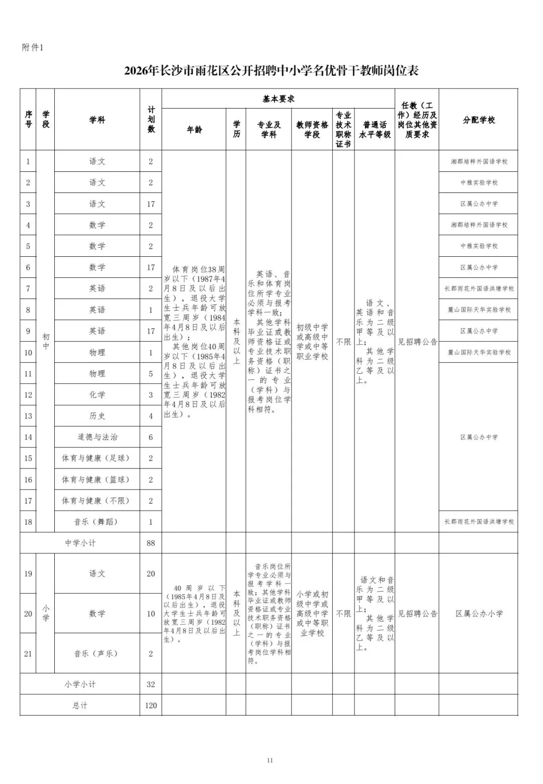 根据工作需要,雨花区面向社会公开招聘中小学名优骨干教师120名(其中初中教师88名、小学教师32名),均为事业编制,详细情况如下: