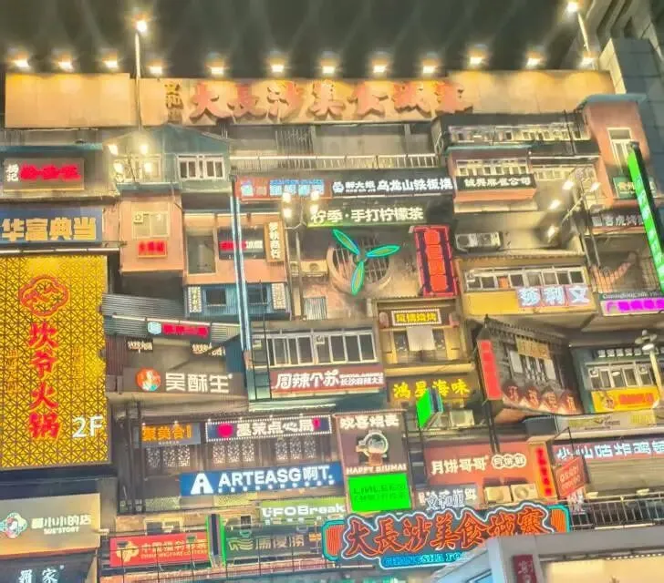 " 坎爷火锅"的金色招牌在2F璀璨夺目那烫金的字体上仿佛还沾着牛油锅底的红油,透着股热辣的劲儿。像是在朝每个行人喊"来涮个牛肉,才叫不辜负这长沙的夜!""吴酥生"看到这店名,似乎就能想到刚出炉的酥饼还在冒着热气,芝麻粒在灯光下闪闪发亮,那香气裹着面香和油香,似乎在店门口打转,直往行人鼻子里钻。"周辣个苏"的红招牌张扬又热烈,后处理的炒勺碰撞声,辣椒在油锅里滋滋声隐约传来把湘味的霸道与爽快写的明明白白;还有"柠季·手打柠檬茶"的绿意招牌仿佛看到了店员在用力捶打着装满柠檬和冰块的雪克杯,"哐哐"的声响。混着柠檬的清酸在灯海间格外清新。