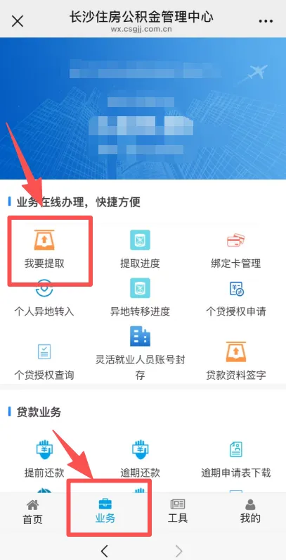 登录“长沙住房公积金”微信公众号,选择底部“业务”模块,点击“我要提取”。