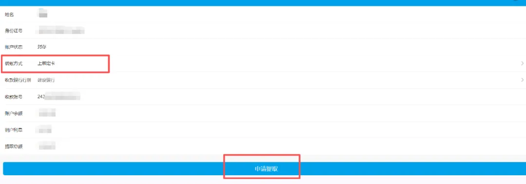 核对提取信息及转账方式。这里分为两种情况: