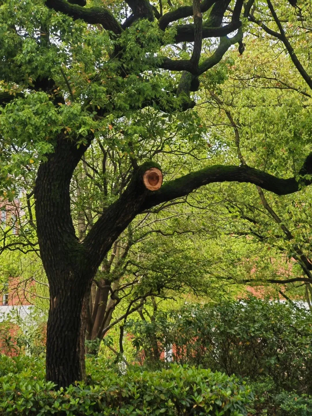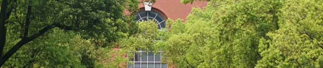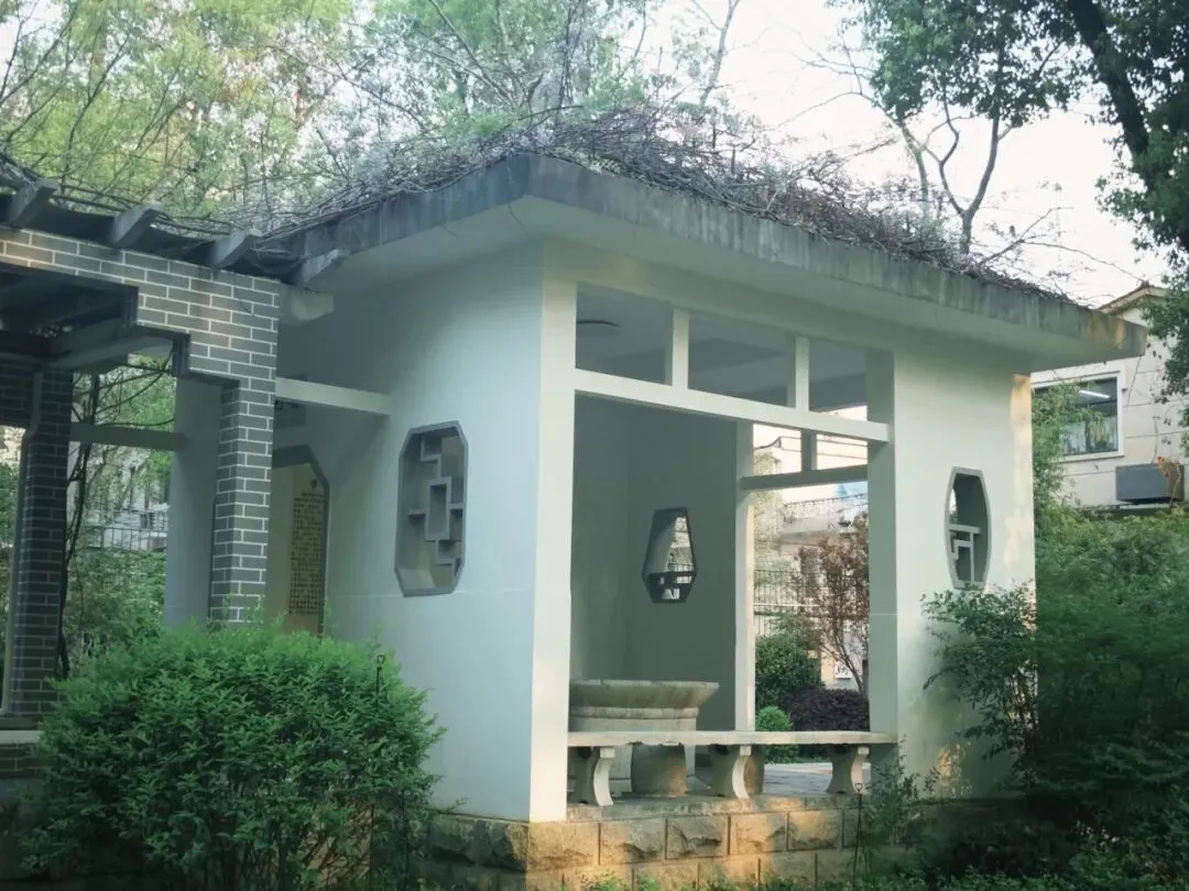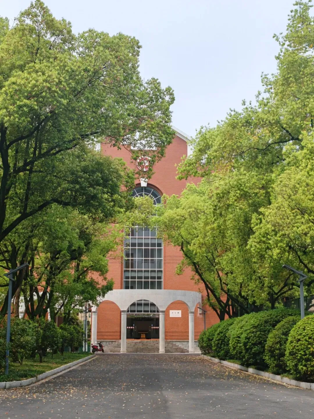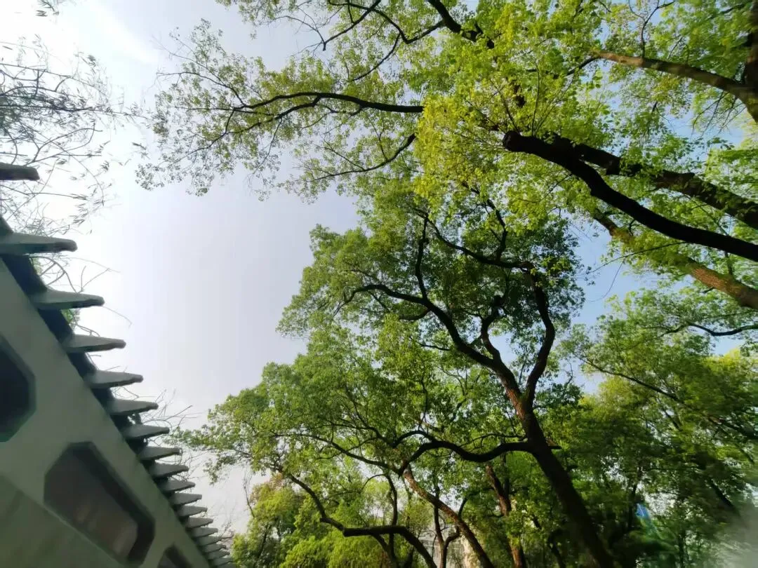 滴翠廊与逸夫楼前风景。滴翠廊隐于葱茏绿意间,白墙漏窗映着春日天光。逸夫楼前香樟成荫,晨光漫过林荫道,少年身影穿行,满是校园的清新与生机。