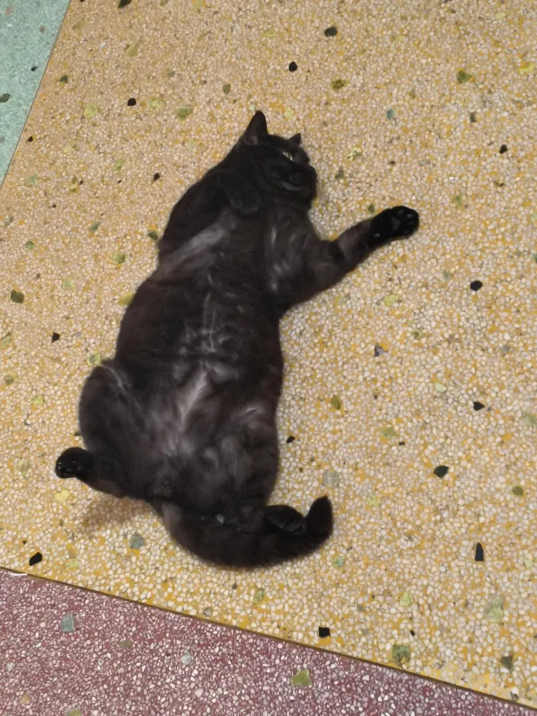去值班路上偶遇一只圆滚滚的猫咪,正四仰八叉躺在地上,肚皮朝天睡得香甜,小爪子放松地舒展着,憨态可掬的模样瞬间治愈了值班的疲惫。