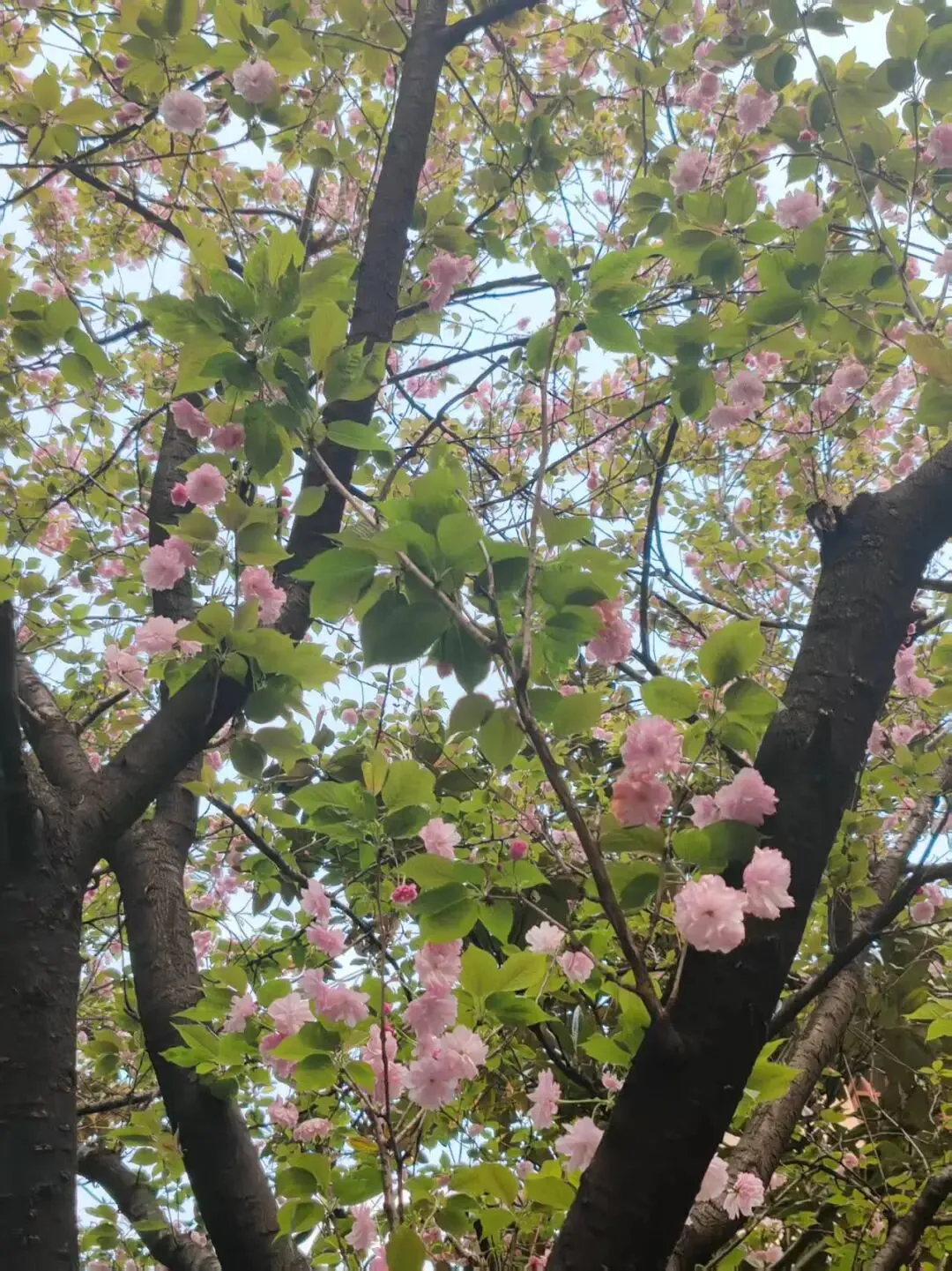 春日午后,润之楼前的八重樱开得正盛。层叠的粉瓣如锦缎堆叠,墨色枝干间缀满繁花,新抽的翠叶衬得花色愈发动人。风拂过枝头,花瓣轻颤,落英簌簌,恰如古诗所云 “樱花烂漫几多时,柳绿桃红两未知”,又似 “八重樱薄红叠,青空映” 的雅致。花香混着书页的墨香漫开,成了校园里最温柔的春日景致。
