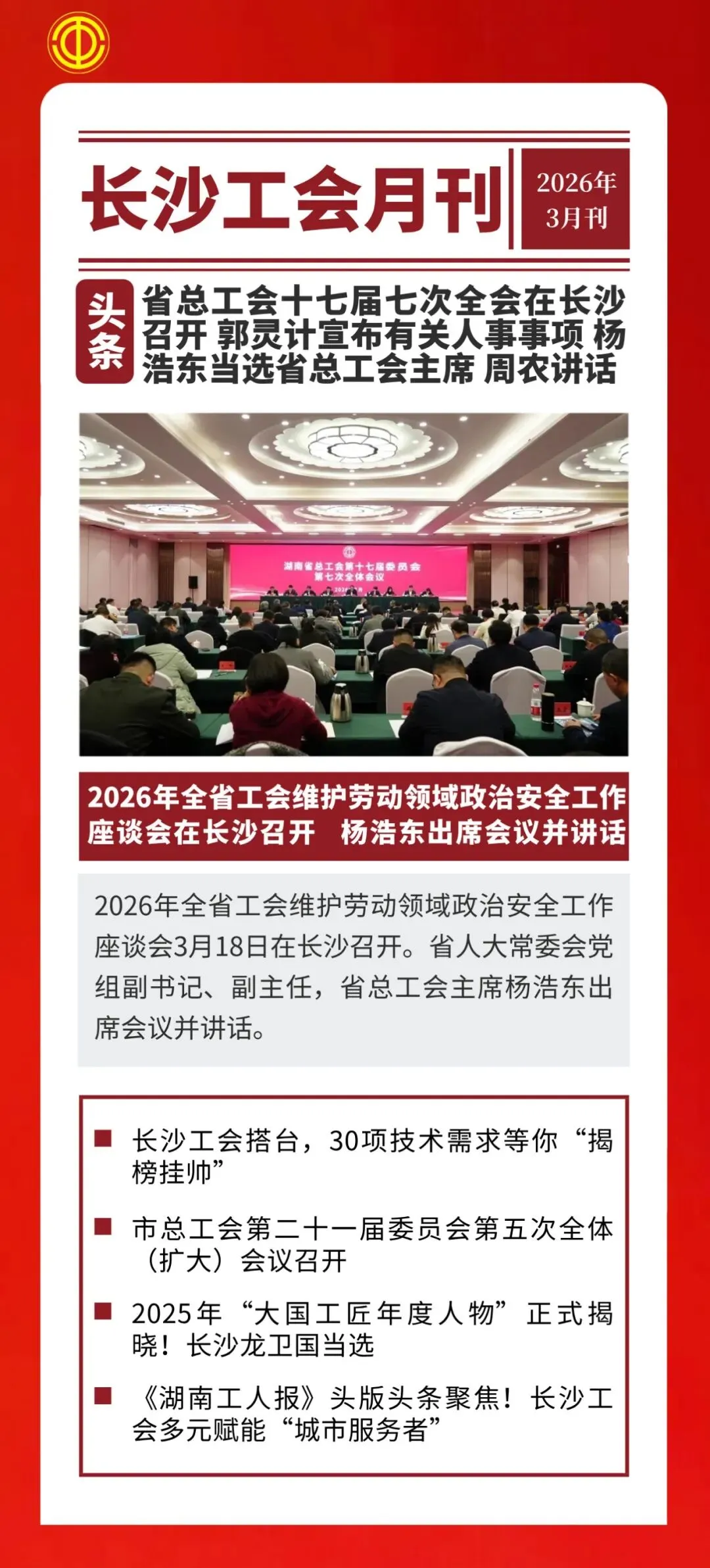2026年全省工会维护劳动领域政治安全工作座谈会3月18日在长沙召开。省人大常委会党组副书记、副主任,省总工会主席杨浩东出席会议并讲话,强调各级工会要以习近平新时代中国特色社会主义思想为指导,全面贯彻党的二十大和二十届历次全会精神,深入贯彻习近平总书记关于国家安全和社会稳定重要指示批示精神,传达学习2026年全国工会维护劳动领域政治安全工作座谈会精神,深入贯彻总体国家安全观,全面落实“五个坚决”要求,扎实做好我省劳动领域政治安全工作。省总工会党组书记、副主席罗琼参加。(查看新闻详情)