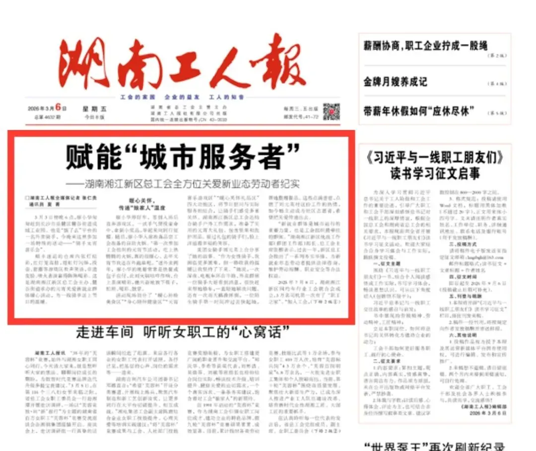 新就业群体是城市运行的重要力量,也是工会组织最牵挂的群体。湖南湘江新区总工会推出了一系列务实举措,为新就业形态劳动者提供法律咨询,维护劳动报酬、职业安全等合法权益。(查看新闻详情)