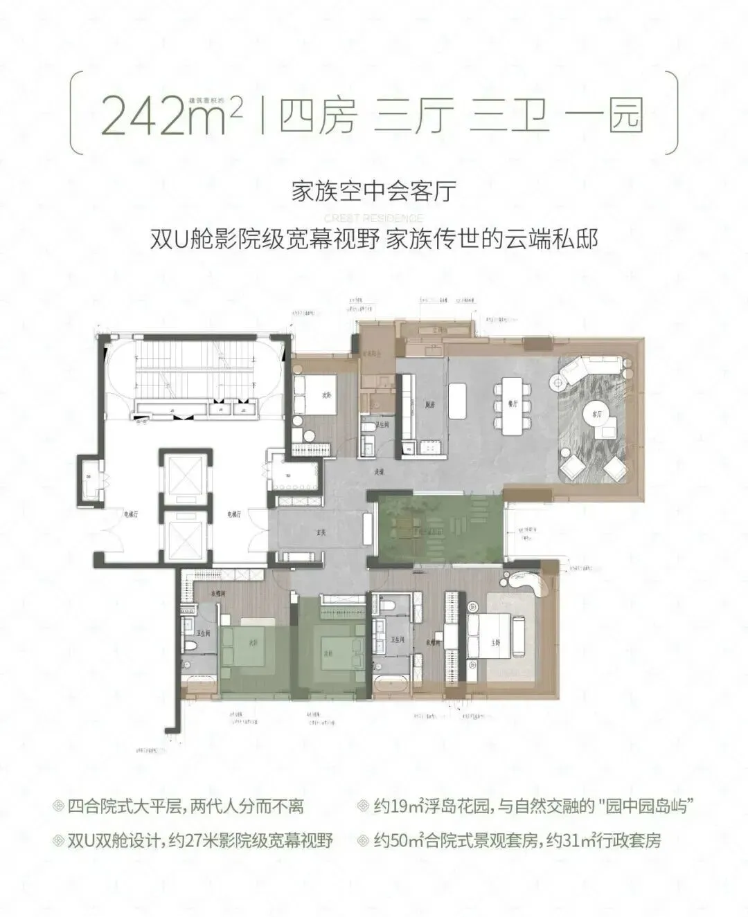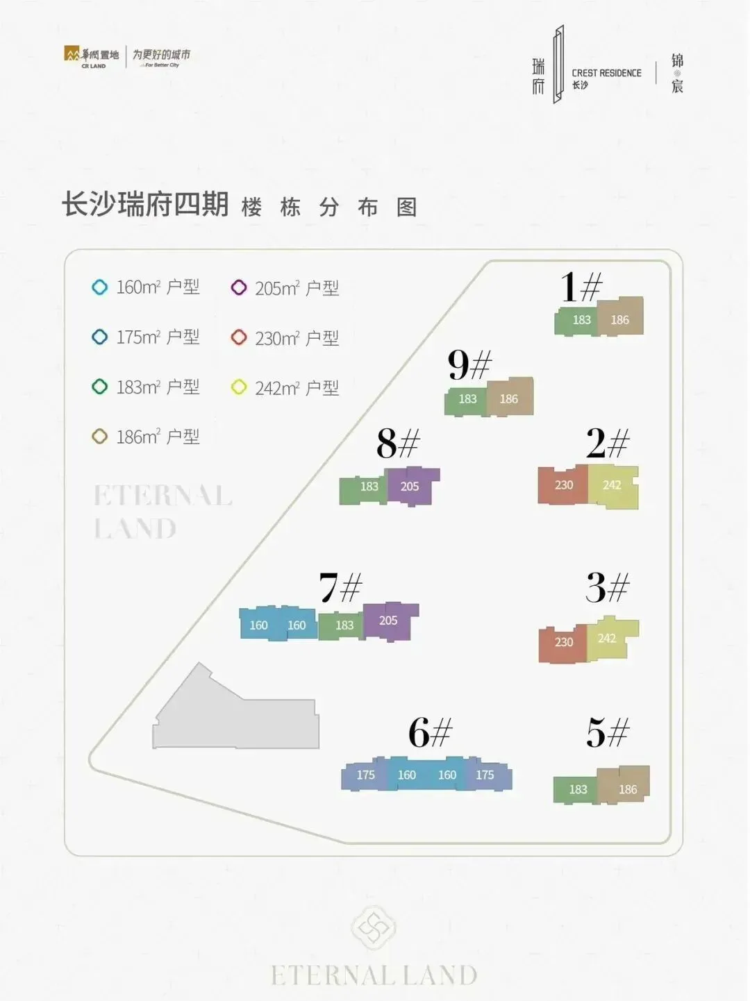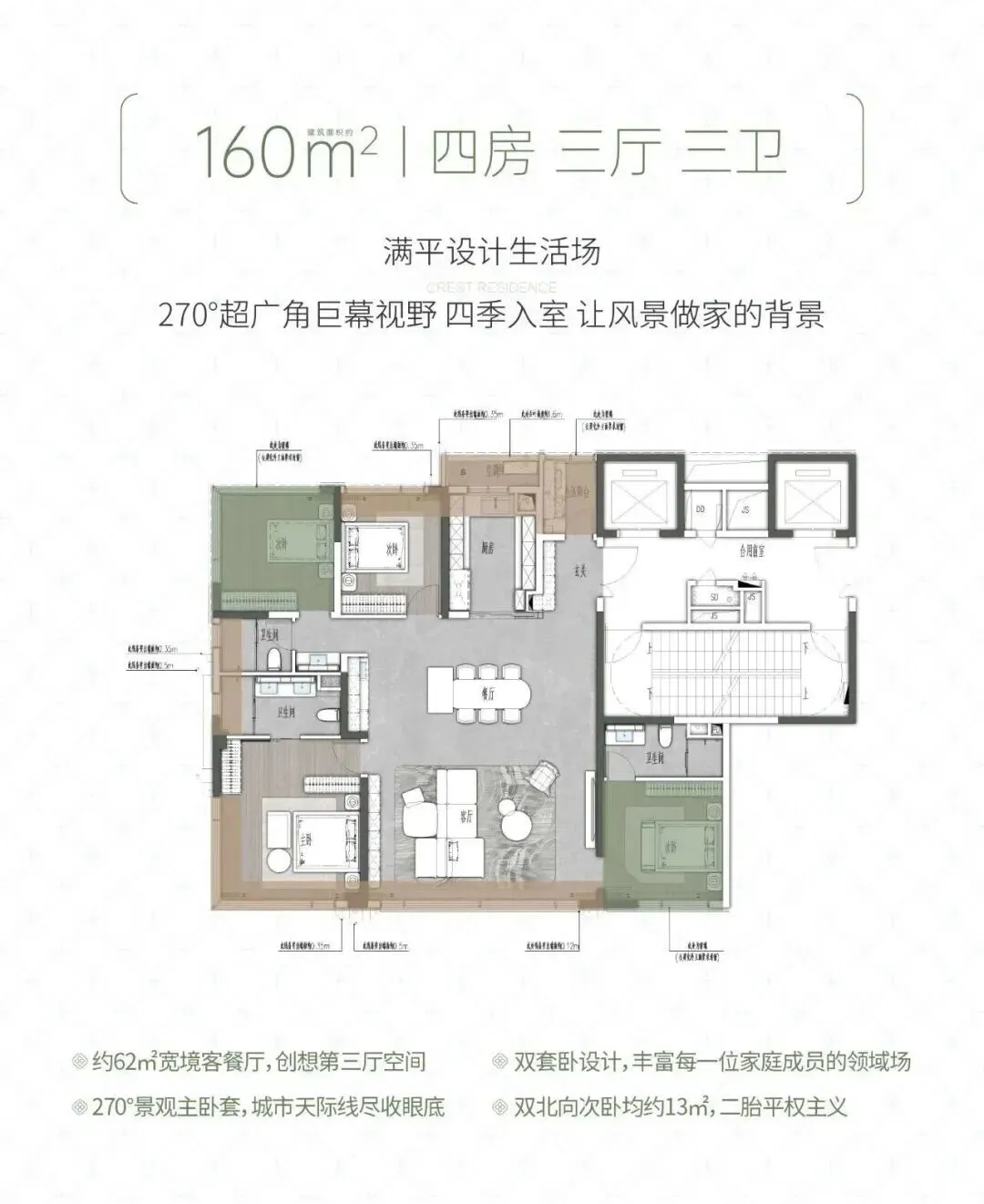 户型从 160㎡到 242㎡,全是大平层,方厅设计、大面宽采光,多孩家庭也能住得宽敞,得房率表现也不错。