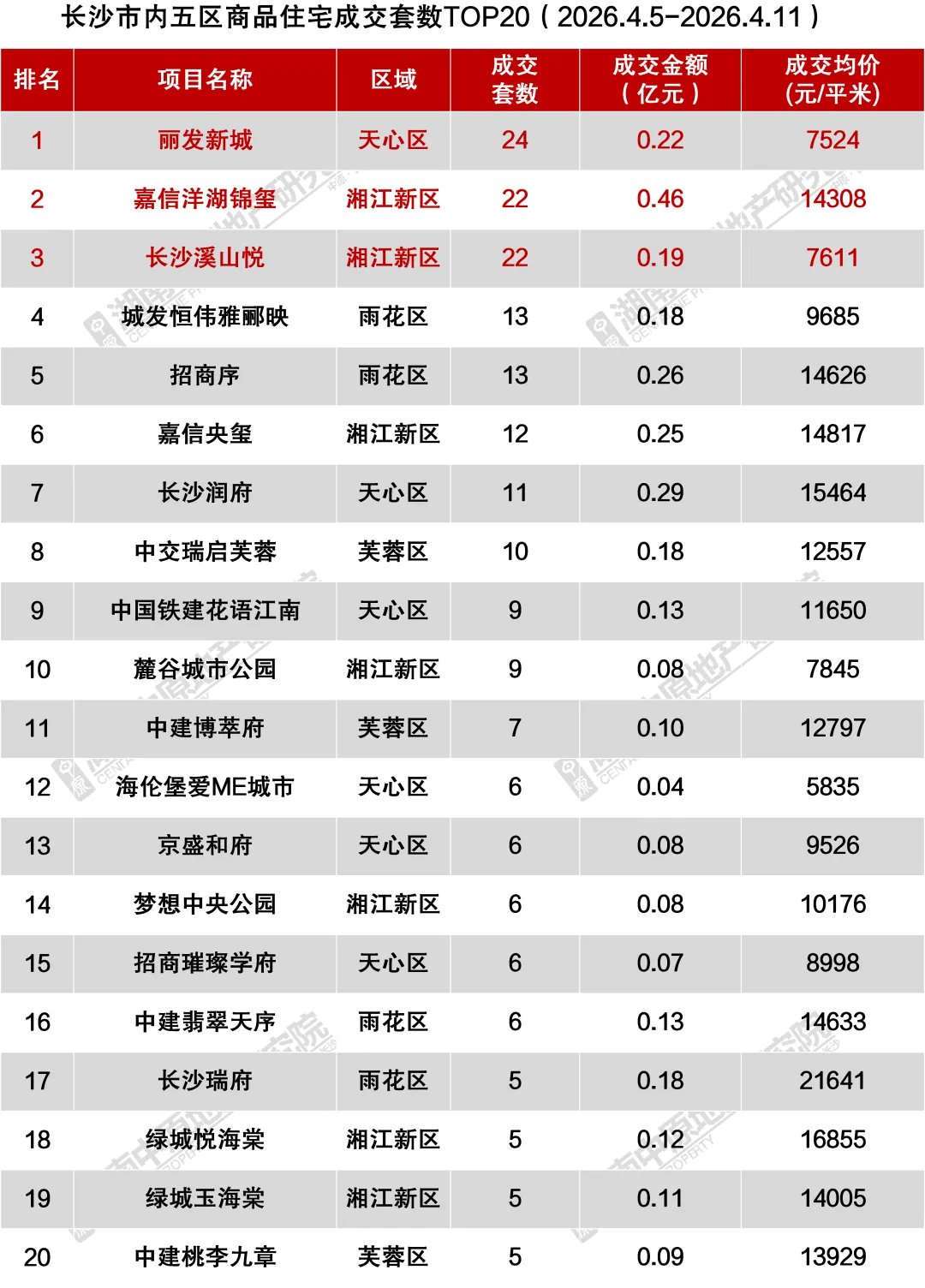 成交套数前三分别为:丽发新城、嘉信洋湖锦玺、长沙溪山悦