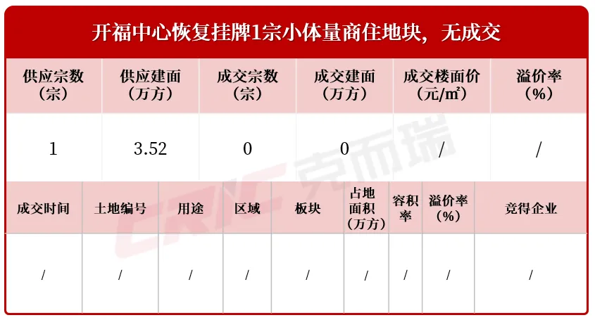 ▶ 本周长沙六区一县仅开福中心恢复挂牌1宗小体量商住地块,无成交