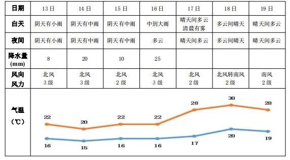 13日(周一),阴天有小雨,北风3级,16~21℃;