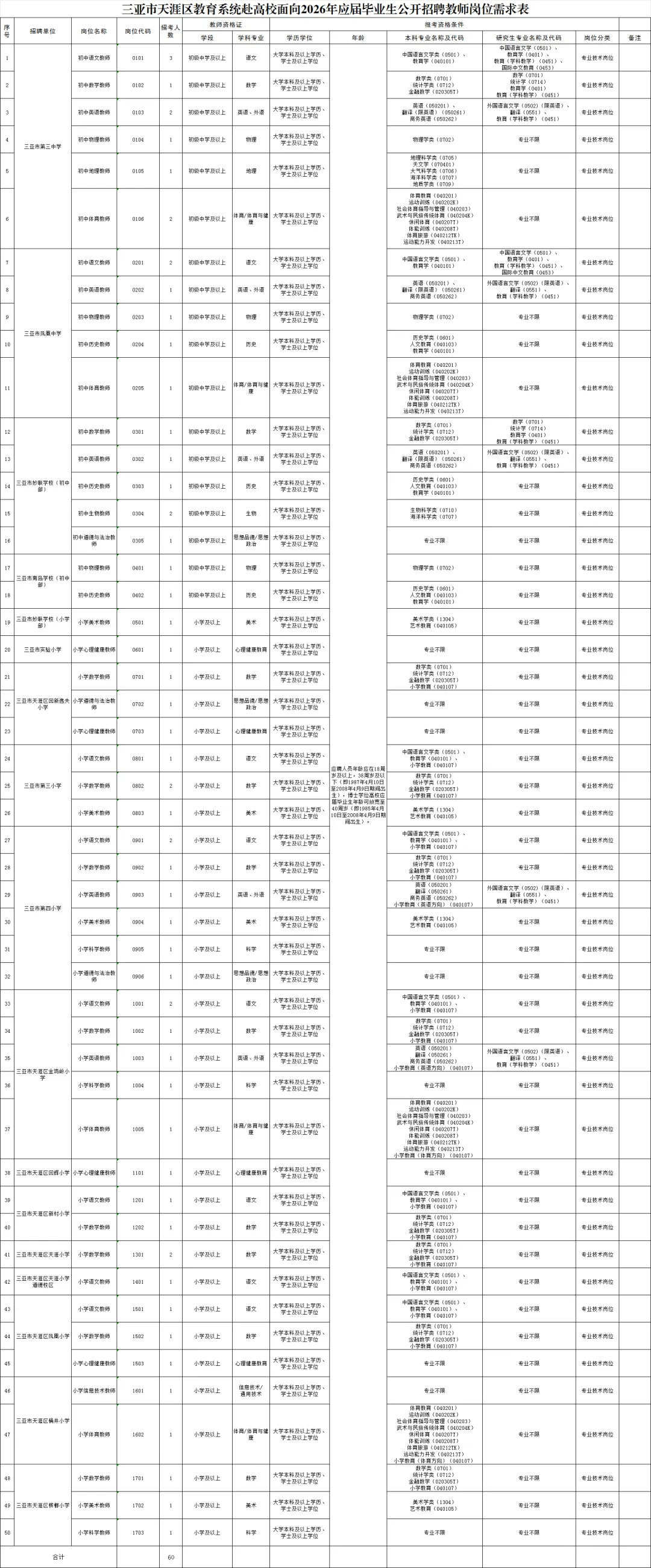 附件1:三亚市天涯区教育系统赴高校面向2026年应届毕业生公开招聘教师岗位需求表