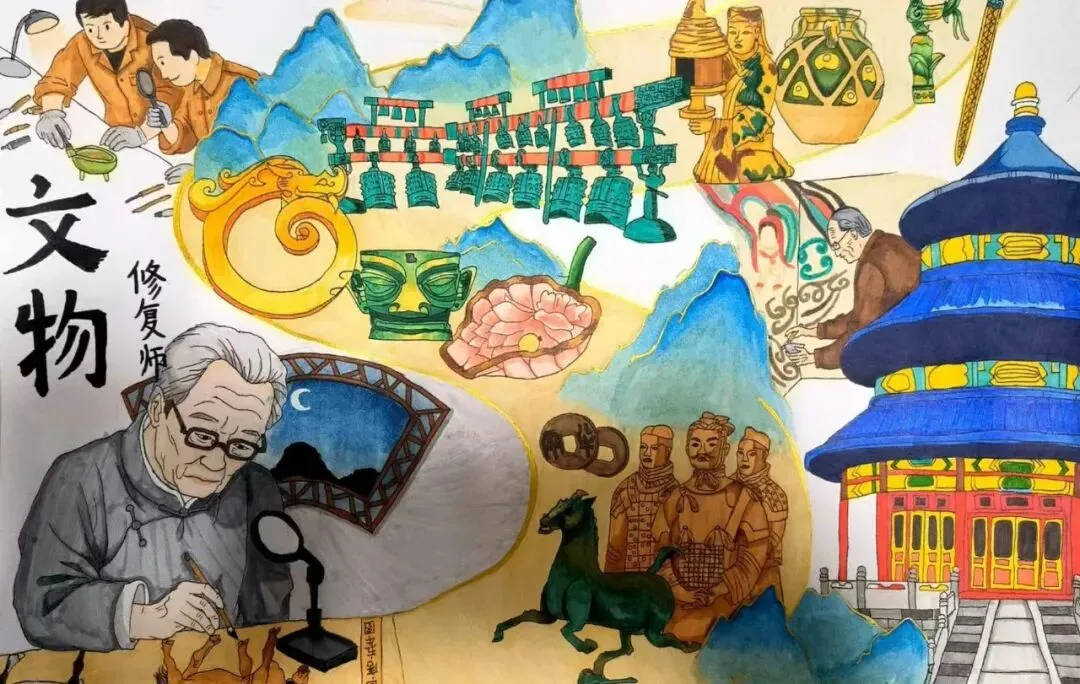 桥驿明德小学德育主任李端利这样解读这幅画:文物修复师是历史文脉的守护者与延续者,用一生专注一事的执着,让破损文物重焕生机。天宫空间站则是中国航天探索宇宙、逐梦星辰的时代标志,代表着当代中国的科技高度。一个扎根大地,守护千年根脉;一个飞向星空,开拓未知未来。一“天”一“地”,一“古”一“今”,在孩子的画笔下奇妙地融合在了一起。