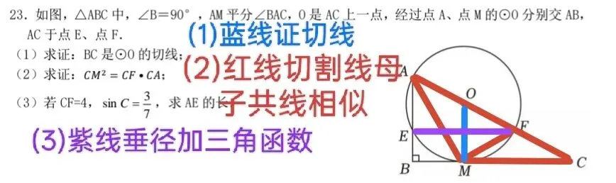 第23题专门考查了圆与相似的基本模型,第一问证切线,第二问熟悉的孩子们应该知道这是我们切割线定理母子共线的相似证明,第三问有三角函数值,那自然是要在直角三角形中,所以圆的垂径定理必不可少。三问考察了你圆与相似的基本功是否扎实。