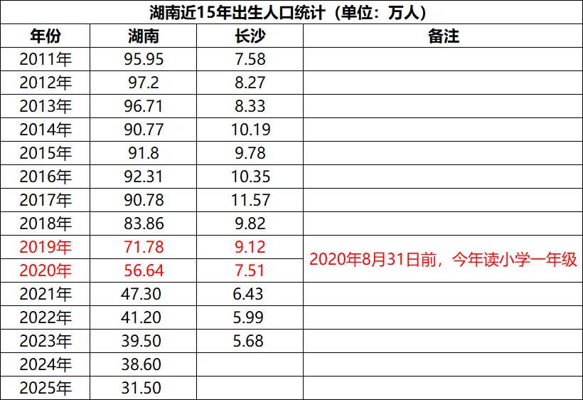 我们今年就读小学一年级的孩子,正是2020年8月31日前满6周岁的儿童。从表中可以看出,从2020年开始,湖南出生人口出现断崖式下降:湖南同比下降27%,长沙也下降了21.4%。