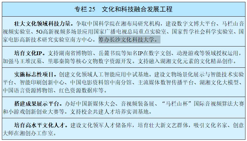 原文指出,要壮大文化领域科技力量。争取中国科学院在湘布局研究机构,建设数字文博大平台、马栏山音视频实验室、5G高新视频多场景应用国家广播电视总局重点实验室、国家哲学社会科学实验室、国家电影高新技术研究实验室南方中心。筹办长沙文化科技大学。