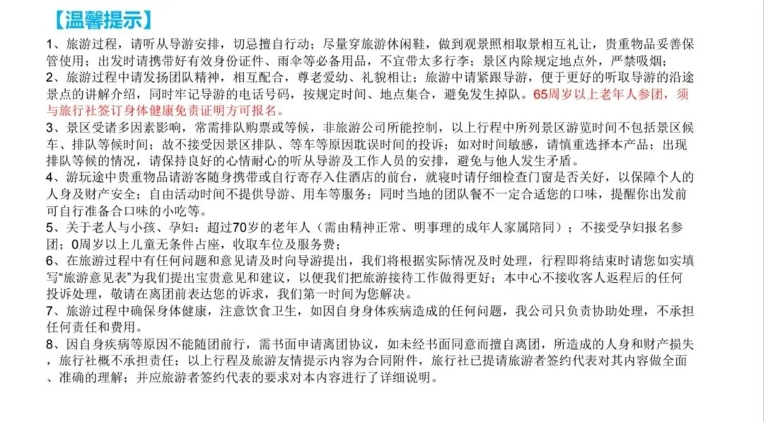 2. 不接受孕妇报团,70岁以上老人需要监护人陪同,必须签订安全免责协议。谢绝有身人本健康问题或有突发病史者报名。