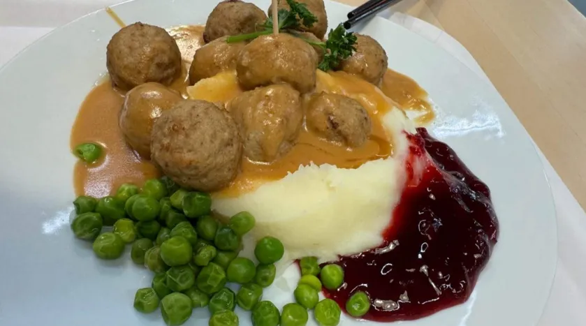 另加了一份瑞典肉丸,配了土豆泥青豆和蓝莓酱,17.99元。肉丸紧致Q弹,配了蓝莓酱的土豆泥绵密酸甜,口感富有层次,是瑞典餐厅里比较经典的味道。
