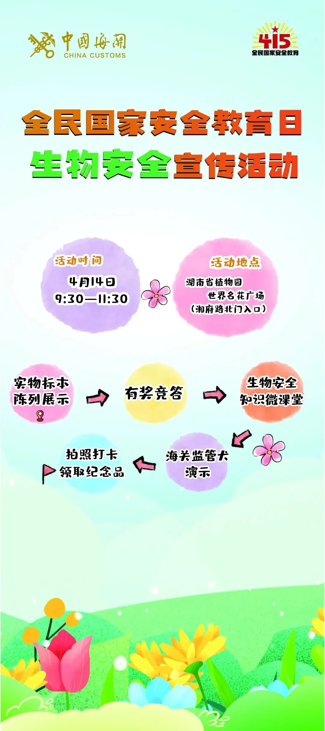 长沙海关和湖南省林业局将于4月14日在省植物园名花广场联合举办全民国家安全教育日生物安全宣传活动,诚邀您共同参与,做生物安全的支持者、宣传者和践行者。