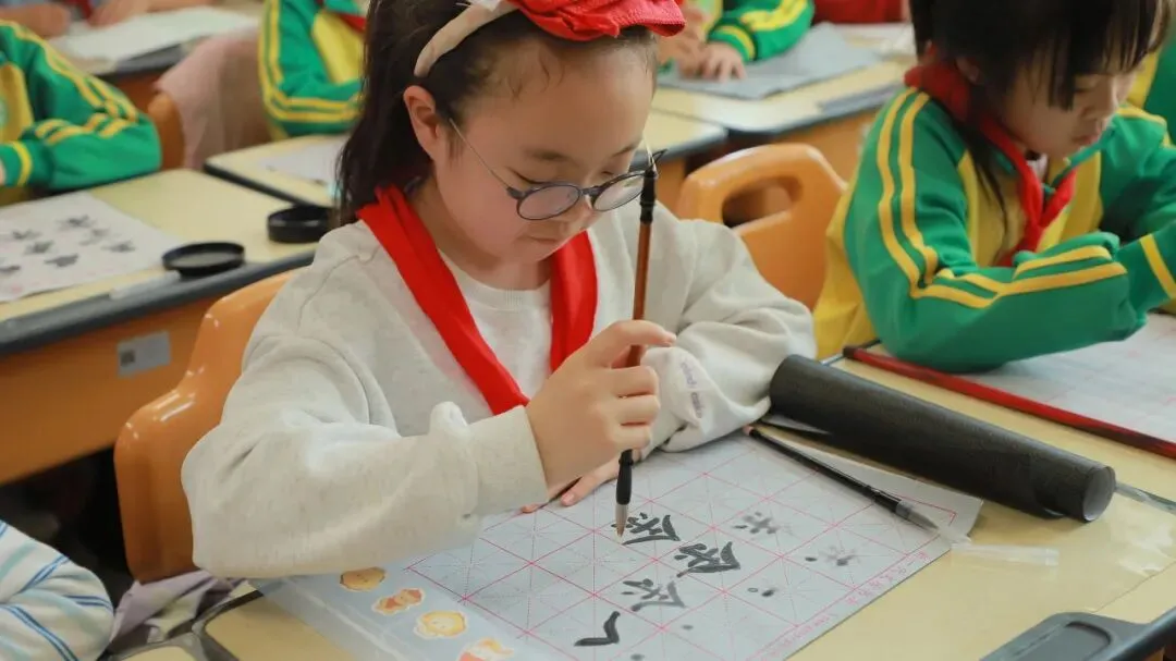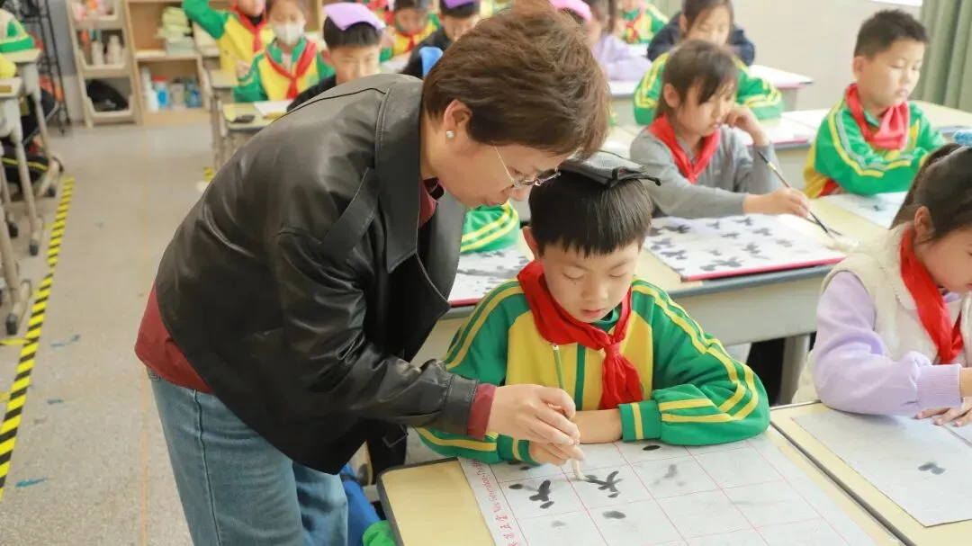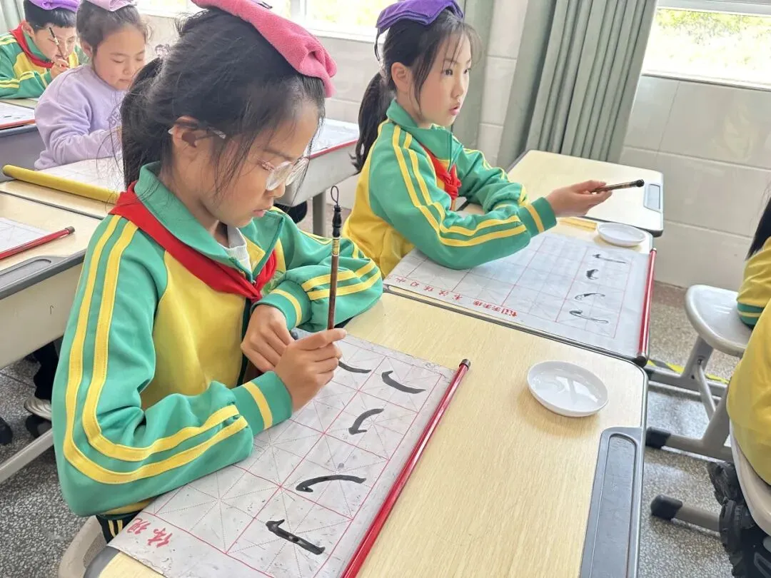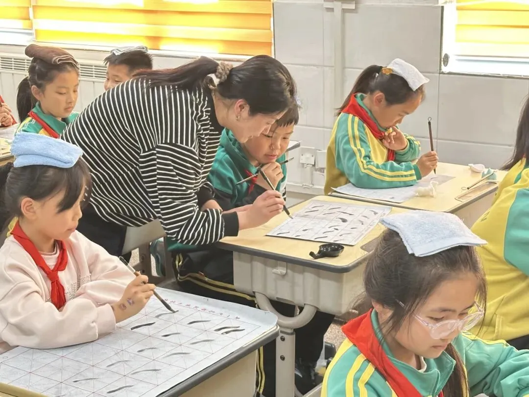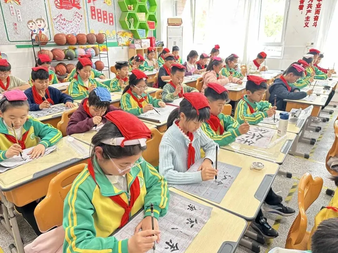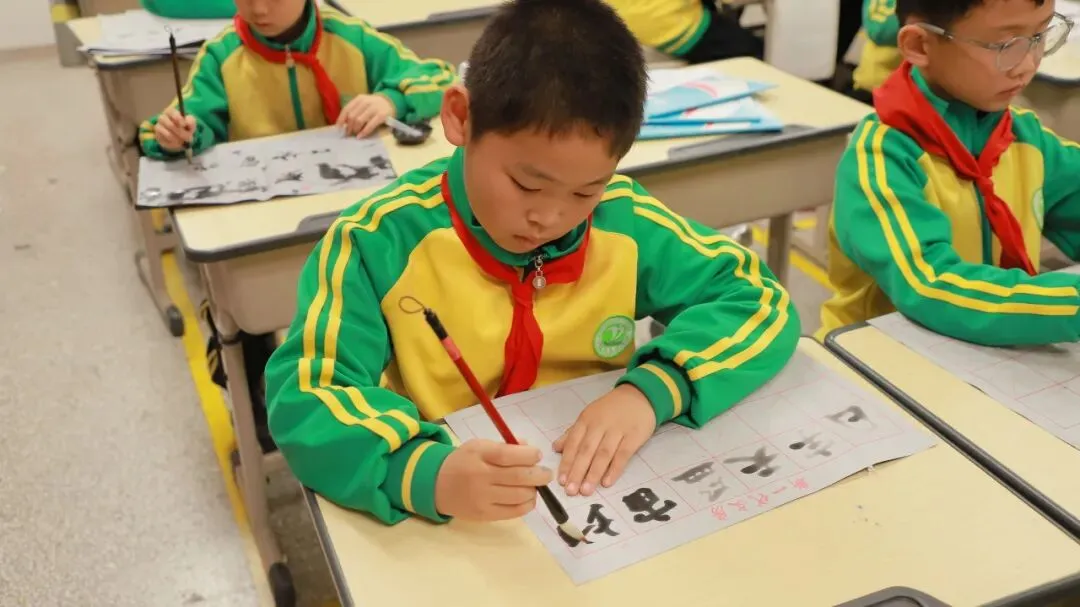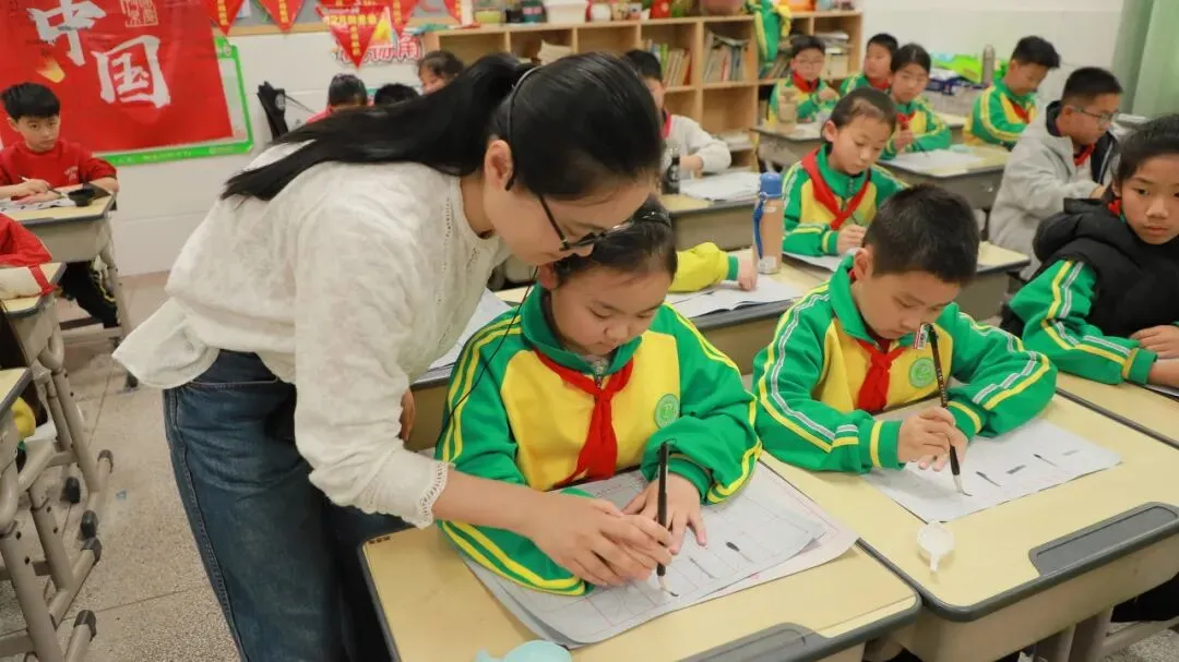 学校用心统筹、有序推进,为书法教育保驾护航——明确各班级每周开设一节毛笔字专项课程,每周五的午间,更专属开辟毛笔字指导时间,悄悄搭建起“课堂细致学+午间慢慢练”的双重练习模式。课堂上,老师们怀揣耐心与热爱,细致讲解握笔姿势、运笔力度,示范起笔的轻盈、行笔的流畅、收笔的沉稳,手把手纠正孩子们的书写小误区,陪着孩子们在笔墨流转中,慢慢发现汉字的线条之美、结构之韵,在潜移默化中提升书写能力。