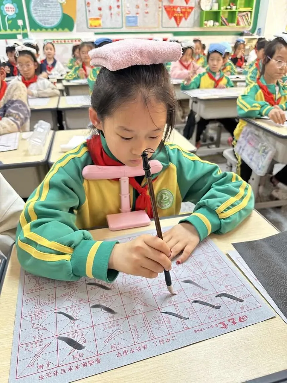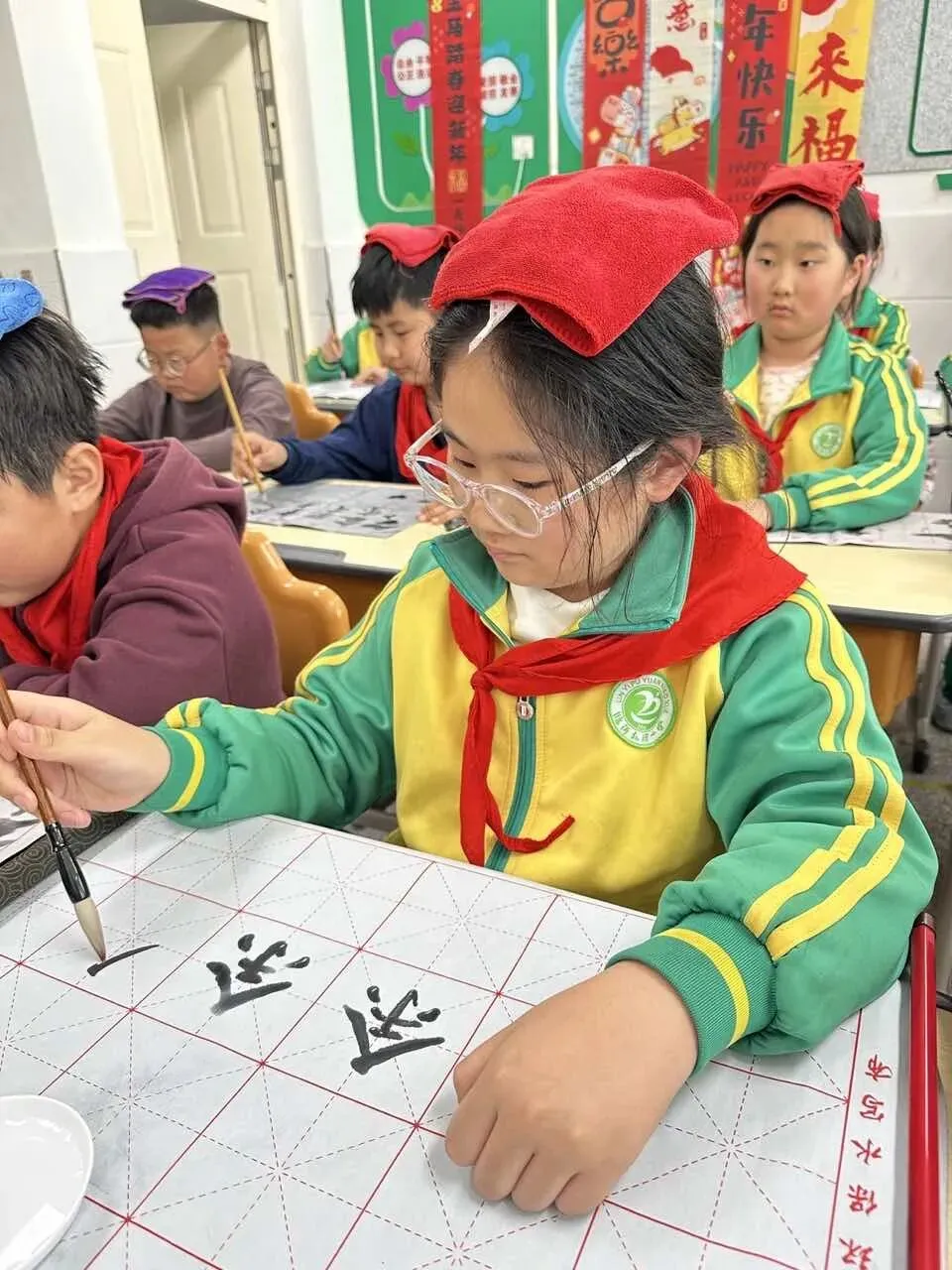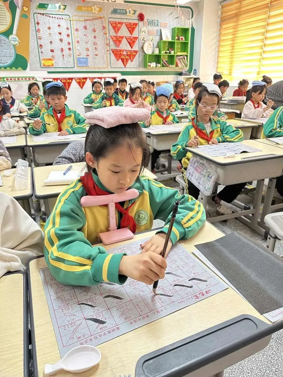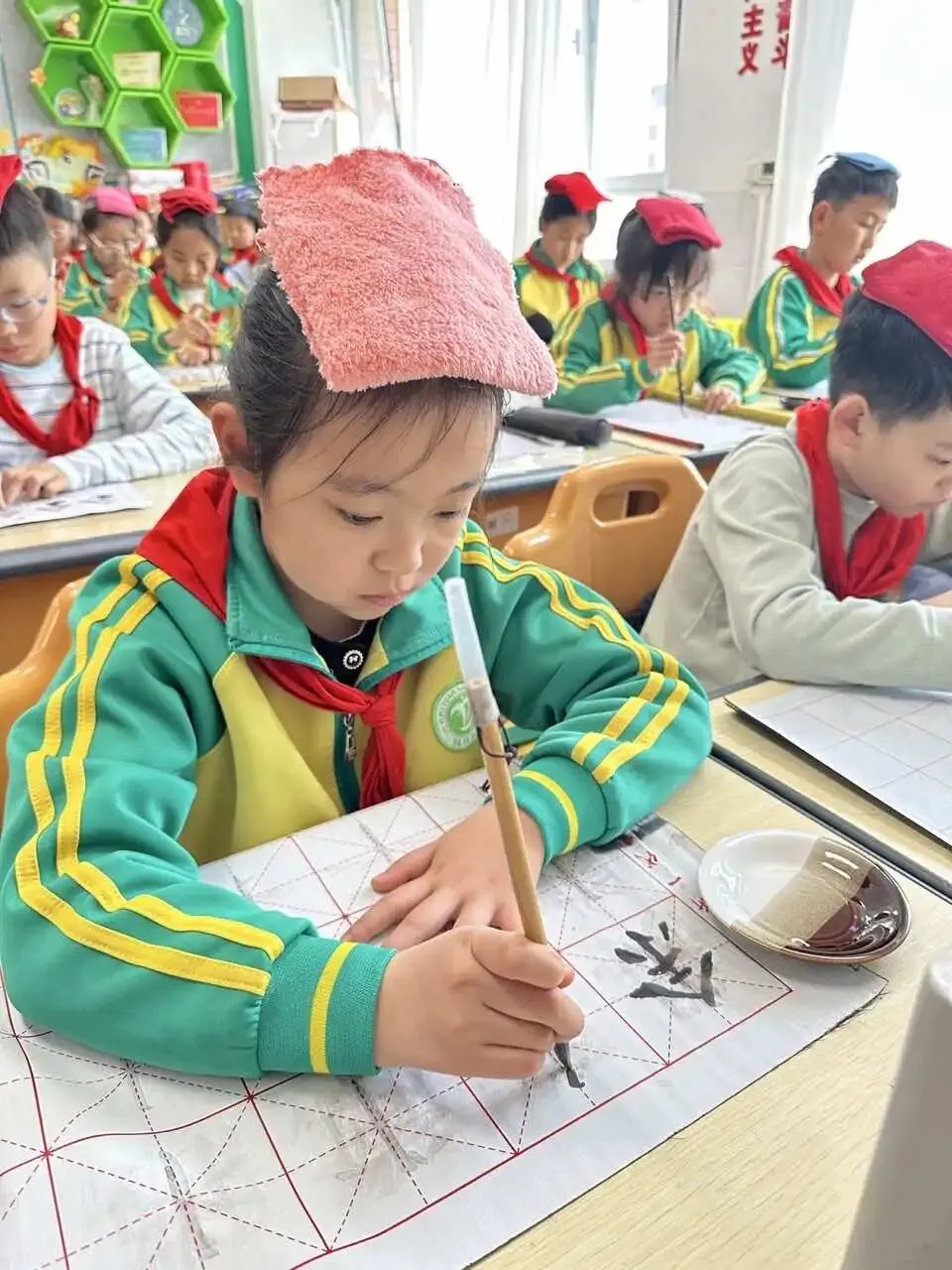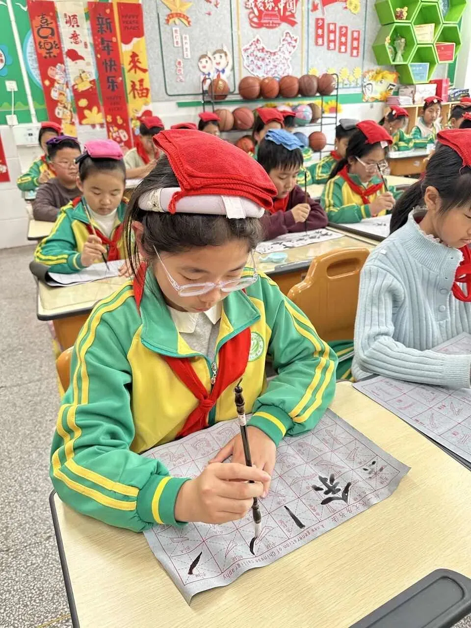学校用心统筹、有序推进,为书法教育保驾护航——明确各班级每周开设一节毛笔字专项课程,每周五的午间,更专属开辟毛笔字指导时间,悄悄搭建起“课堂细致学+午间慢慢练”的双重练习模式。课堂上,老师们怀揣耐心与热爱,细致讲解握笔姿势、运笔力度,示范起笔的轻盈、行笔的流畅、收笔的沉稳,手把手纠正孩子们的书写小误区,陪着孩子们在笔墨流转中,慢慢发现汉字的线条之美、结构之韵,在潜移默化中提升书写能力。