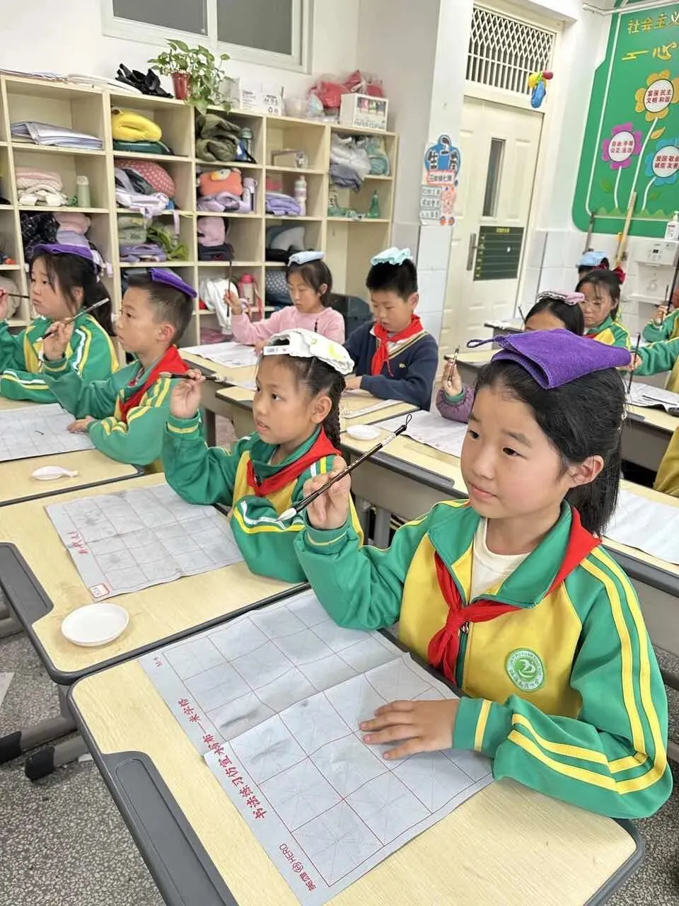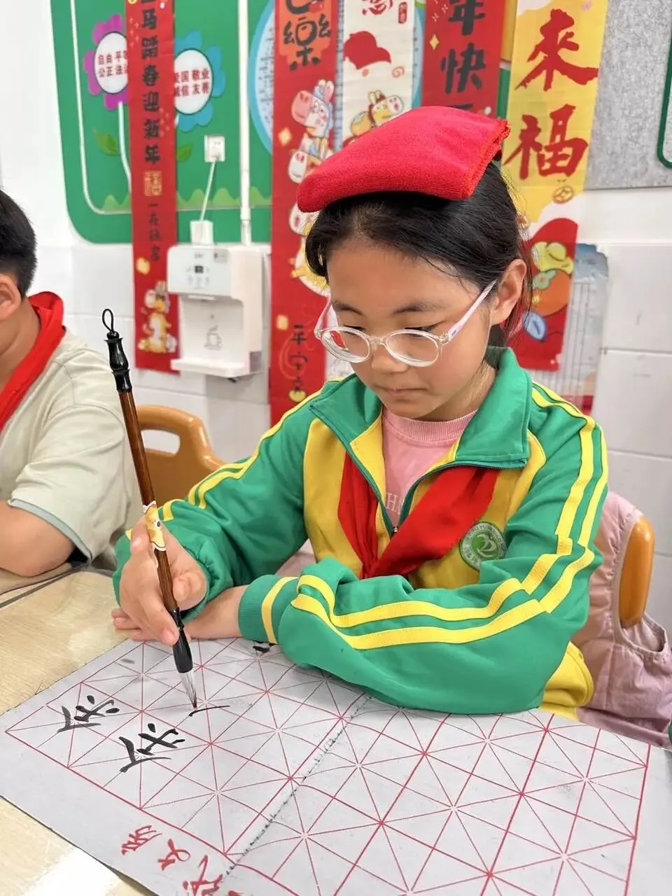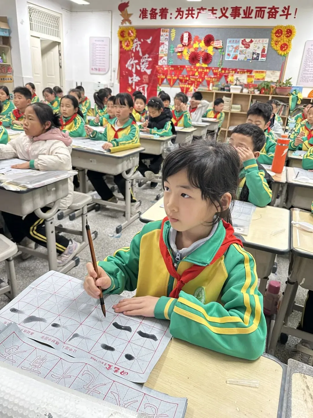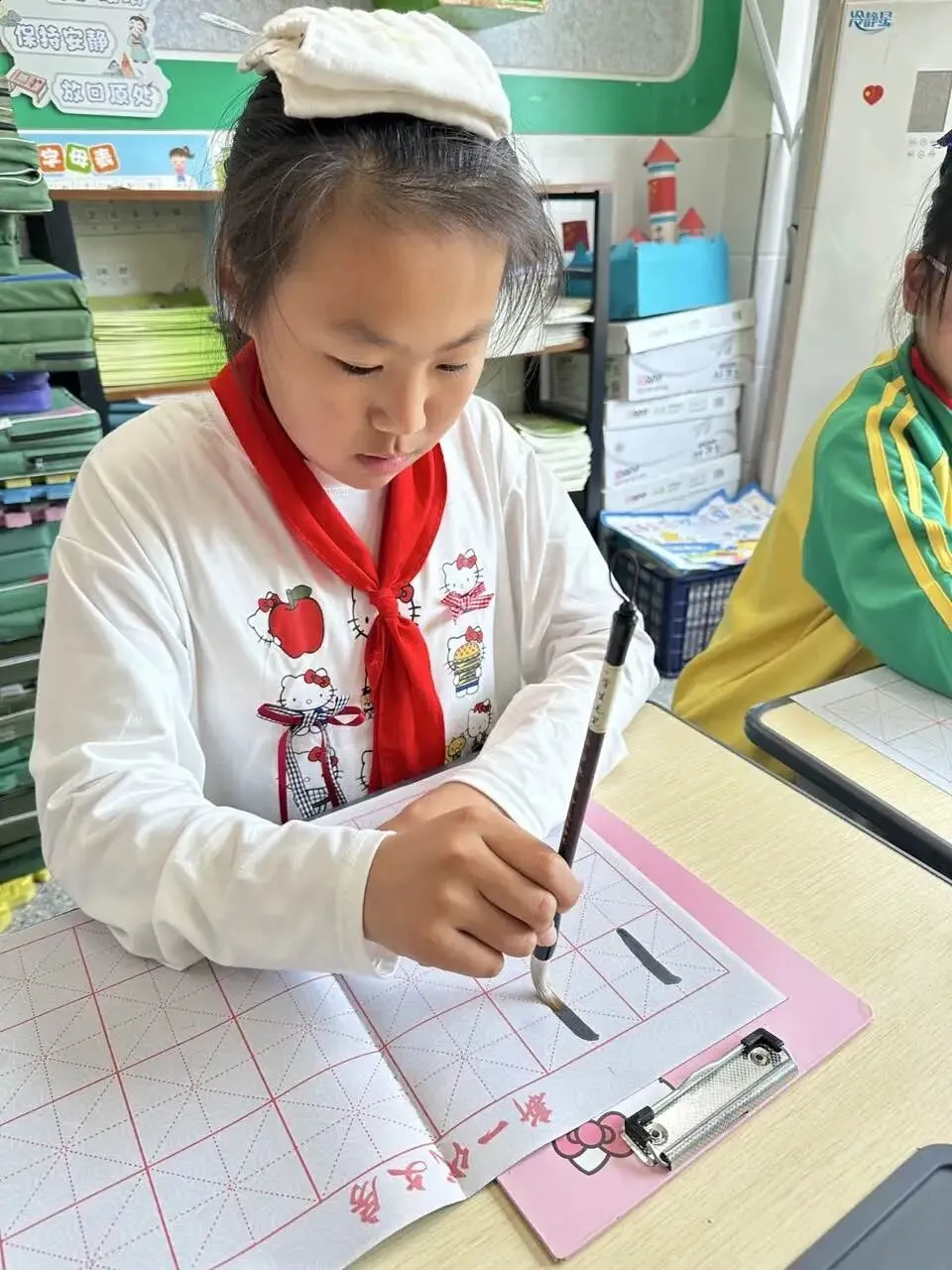 学校用心统筹、有序推进,为书法教育保驾护航——明确各班级每周开设一节毛笔字专项课程,每周五的午间,更专属开辟毛笔字指导时间,悄悄搭建起“课堂细致学+午间慢慢练”的双重练习模式。课堂上,老师们怀揣耐心与热爱,细致讲解握笔姿势、运笔力度,示范起笔的轻盈、行笔的流畅、收笔的沉稳,手把手纠正孩子们的书写小误区,陪着孩子们在笔墨流转中,慢慢发现汉字的线条之美、结构之韵,在潜移默化中提升书写能力。