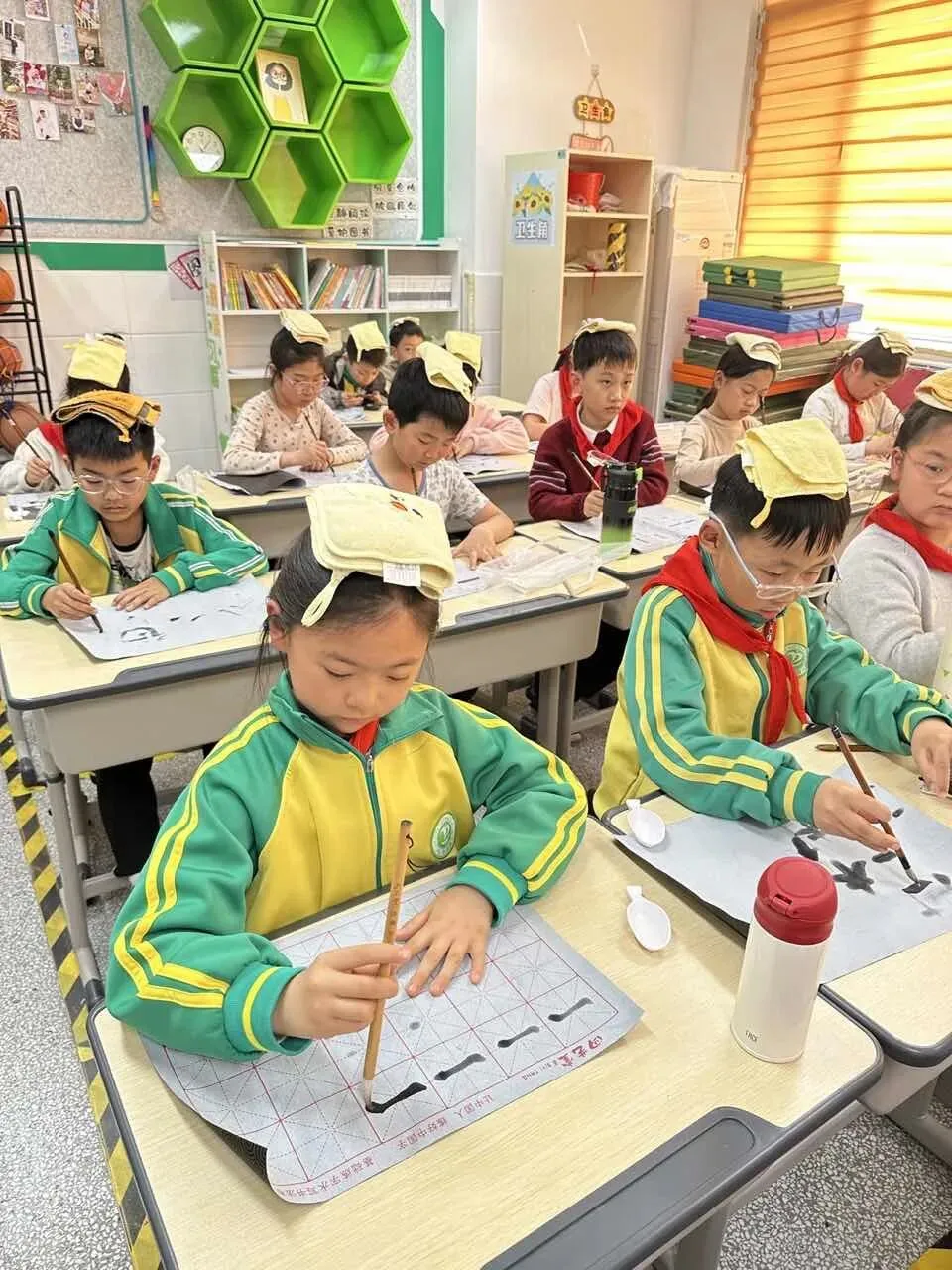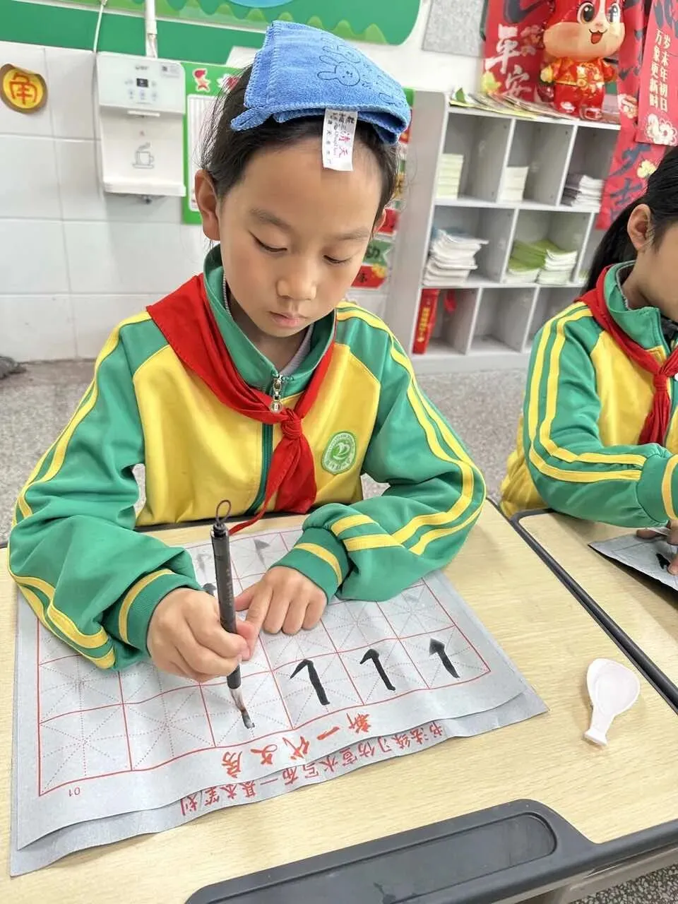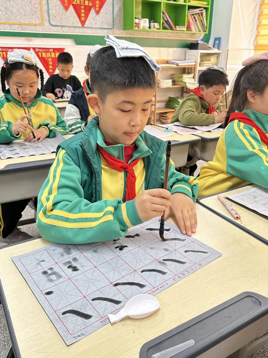 为让孩子们轻松练习、快乐书写,兼顾环保与便捷,学校暖心号召家长们为孩子准备水洗布。清水蘸笔,落笔便晕开清晰的字迹,风过水干,字迹悄然褪去,无需担心笔墨弄脏衣物、浪费纸张,也彻底打消了孩子们练习时的畏难与拘谨,让反复临摹、大胆尝试成为校园里最寻常的美好。每到周五午间,校园里格外静谧,孩子们端坐案前,敛神静气,小小的笔尖蘸着清水,在布面上一笔一画认真书写,清水流淌间,工整的字迹缓缓浮现,轻轻的运笔声,交织成校园里最治愈、最动人的旋律。