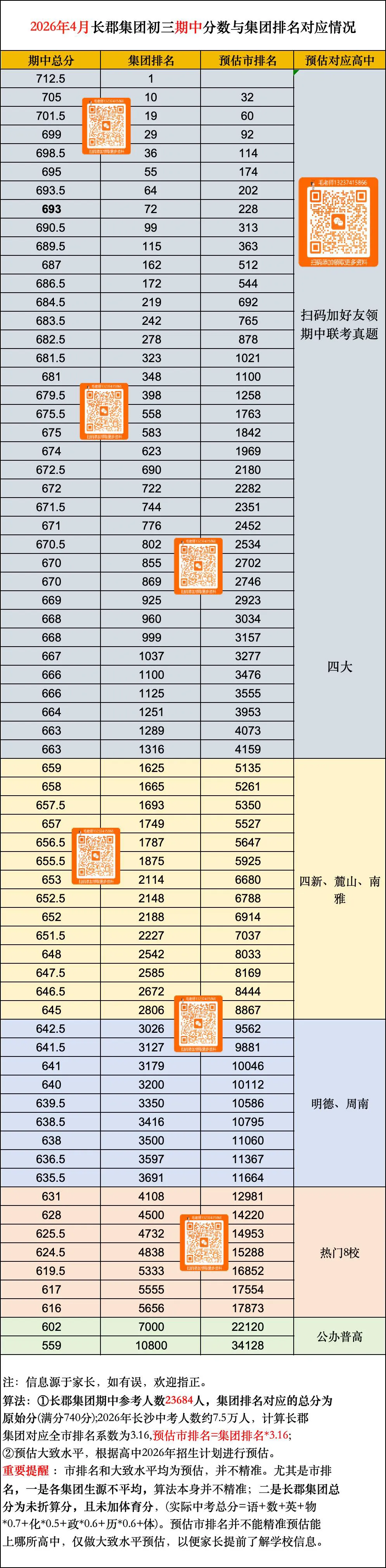 全市排名换算方法为:2026年中考生约7.5万人,本次模考23684万人参考,用75000÷23684,得到一个系数3.16,再用孩子的集团排名乘以3.1,可得到一个粗略的全市排名。