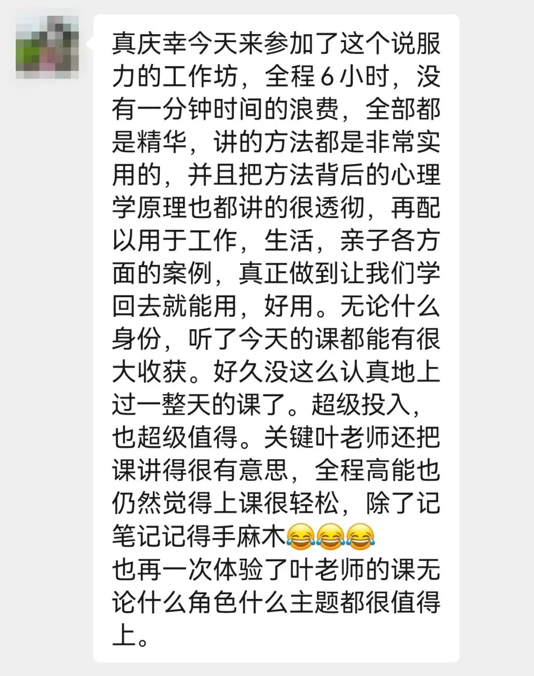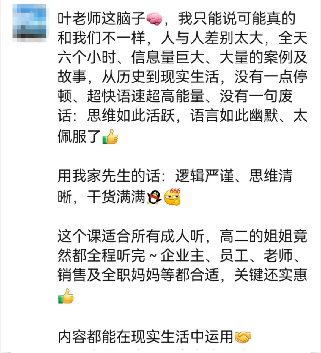 有学员在听完课程之后,把学到的方法用在工作中,业绩翻了一倍。还有学员把影响力技巧用在生活中,搞定了老公和婆婆。