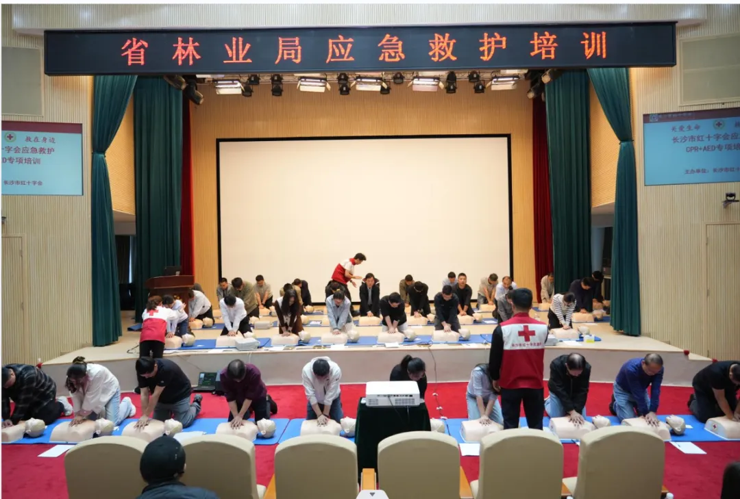 这是湖南省林业局专门组织的CPR(心肺复苏)+AED(自动体外除颤器)持证培训,采取“理论+实操+考核”的严格模式。令参训人员印象深刻的是,林业局领导班子成员不仅全程参与,更带头反复练习胸外按压。这种自上而下的重视,让整场培训氛围格外扎实。从判断意识、呼吸,到呼救,再到胸外按压、人工呼吸,直至AED设备的规范使用,每一位学员都在师资的一对一纠偏中,把动作练成了“肌肉记忆”。