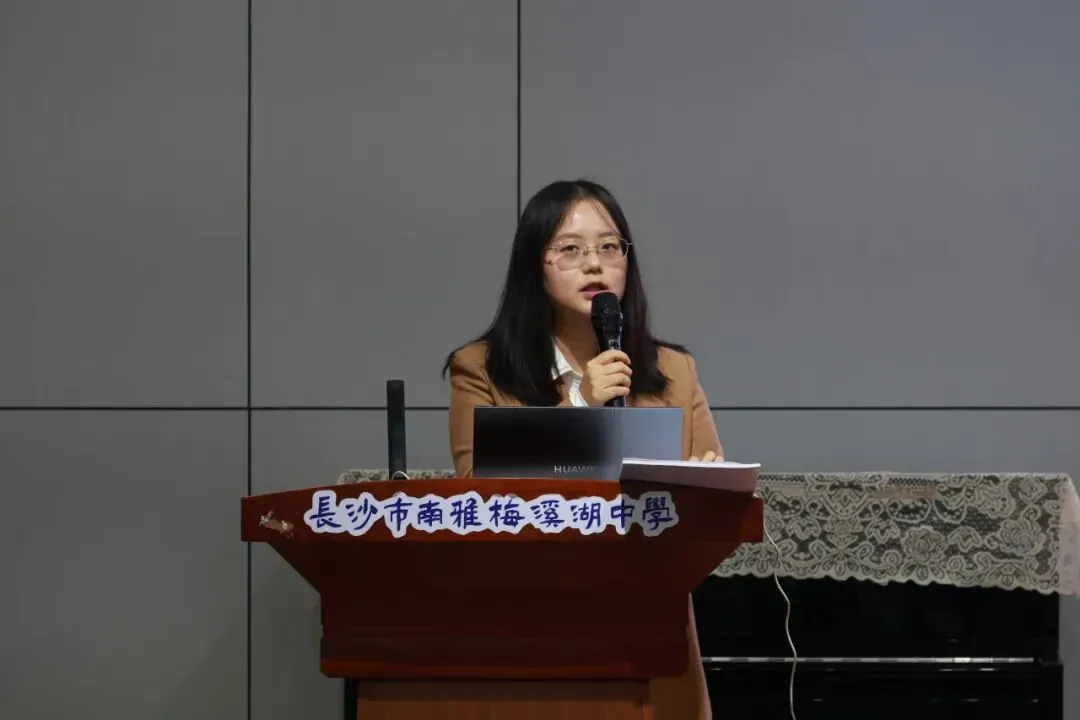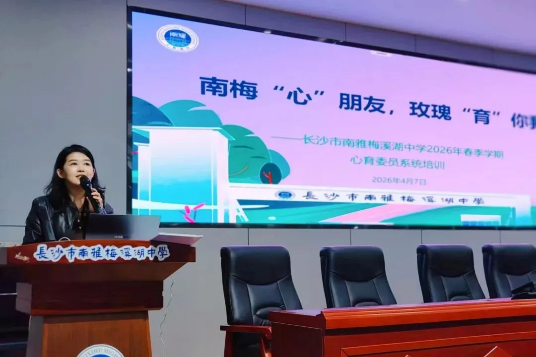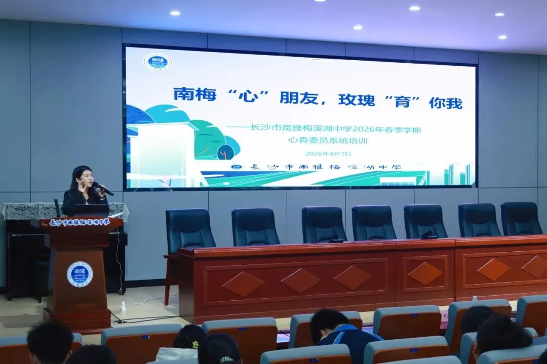 4月10日中午,长沙市南雅梅溪湖中学 2026 年春季学期心育委员培训在迎曦楼报告厅顺利举行。本次培训以“南梅‘心’朋友,玫瑰‘育’你我”为主题,全体班级心育委员参会,纪检委员唐佳莉、教育处主任周春华、团委书记周碧莲、教育处后备干部刘强出席活动,培训由心理健康发展中心负责人王晶老师主持。