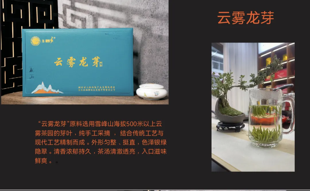 “忆·湘情红”牌云雾龙芽绿茶。曾荣获中国国际茶叶博览会金奖、“潇湘杯”名优茶评选金奖,品质备受肯定。/这款茶,外型匀整、挺直,色泽翠绿,原料选用雪峰山脉海拔500米以上云雾茶园的芽叶,纯手工采摘,经过我们测算,每制作一斤干茶,需要四万多颗鲜嫩芽头,足见其珍贵。经手工与机械相结合而成。冲泡过后,芽叶在杯中缓缓舒展开来,起起落落,仿佛在清澈的茶汤中轻盈舞蹈,极具美感。茶香随之升腾,清香浓郁而持久。茶汤清澈透亮,入口滋味鲜爽甘醇,叶底匀整细嫩,尽显春茶之鲜活。