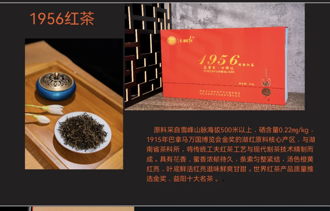 “忆·湘情红”牌1956工夫红茶。曾获得“茶祖神农杯”名优茶评选金奖、“潇湘杯”湖南名优茶评选金奖,并评为“益阳十大名茶”之一。/公司主打一款60年安化荒野群体种制作的红茶,原料采自雪峰山脉页片岩土质,硒元素含量0.22㎎/㎏,海拔800米以上,1915年巴拿马万国博览会金奖的湖红原料核心产区,与省茶科所包小村所长携手,将传统工夫红茶工艺与现代制茶技术相融合,共同打磨出了这款独具湖红风韵的佳作。