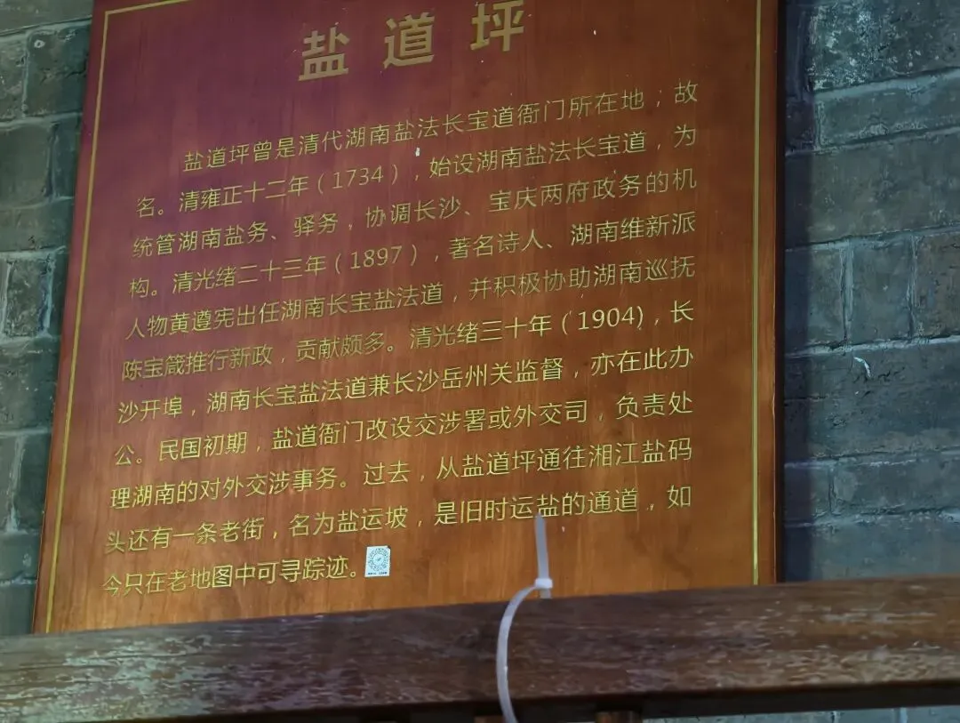 清同治《长沙县志》载:雍正十二年(1734年),朝廷设“驿盐长宝道”于此,专管湖南盐务、驿站,并协调长沙、宝庆(今邵阳)两府政务——盐道坪因此得名。