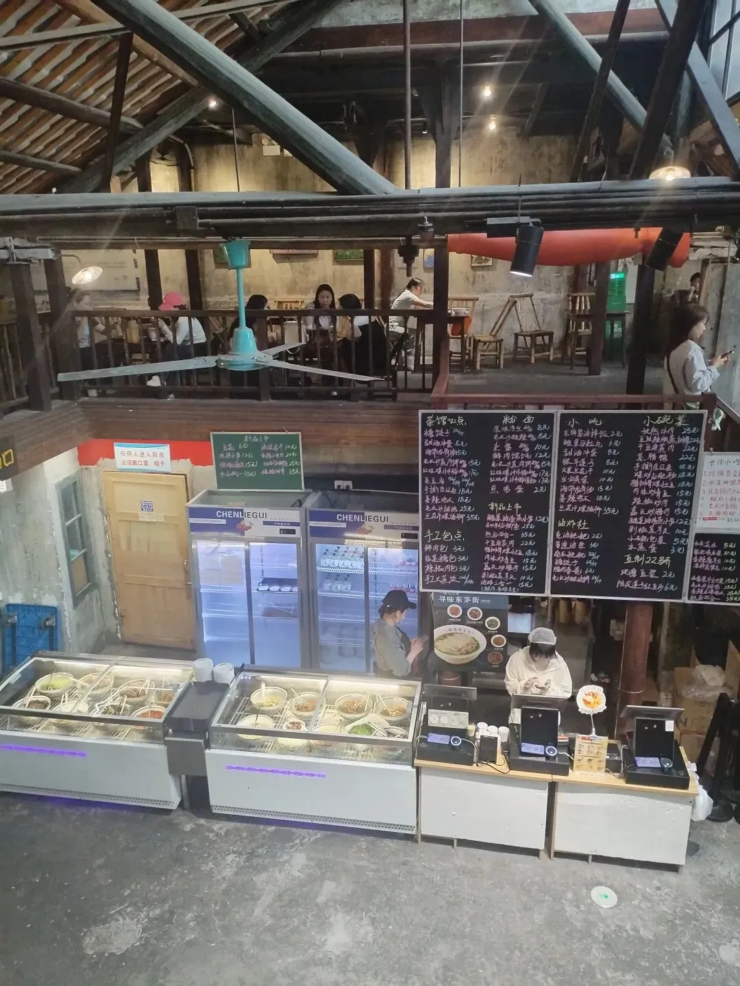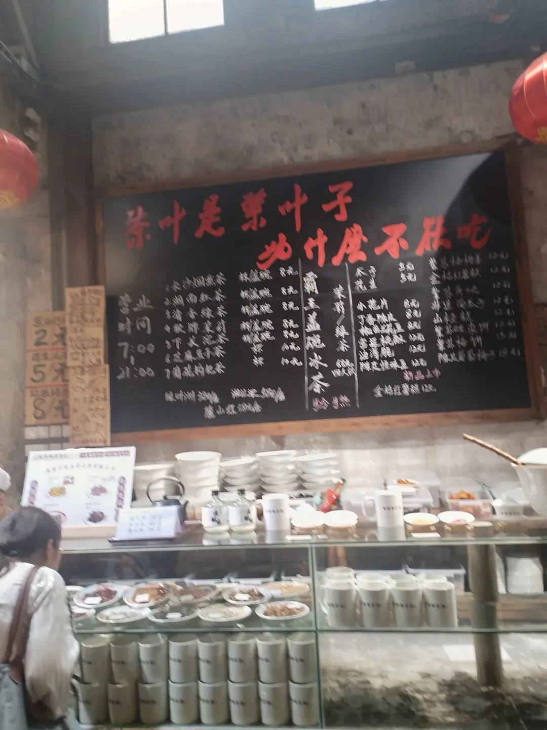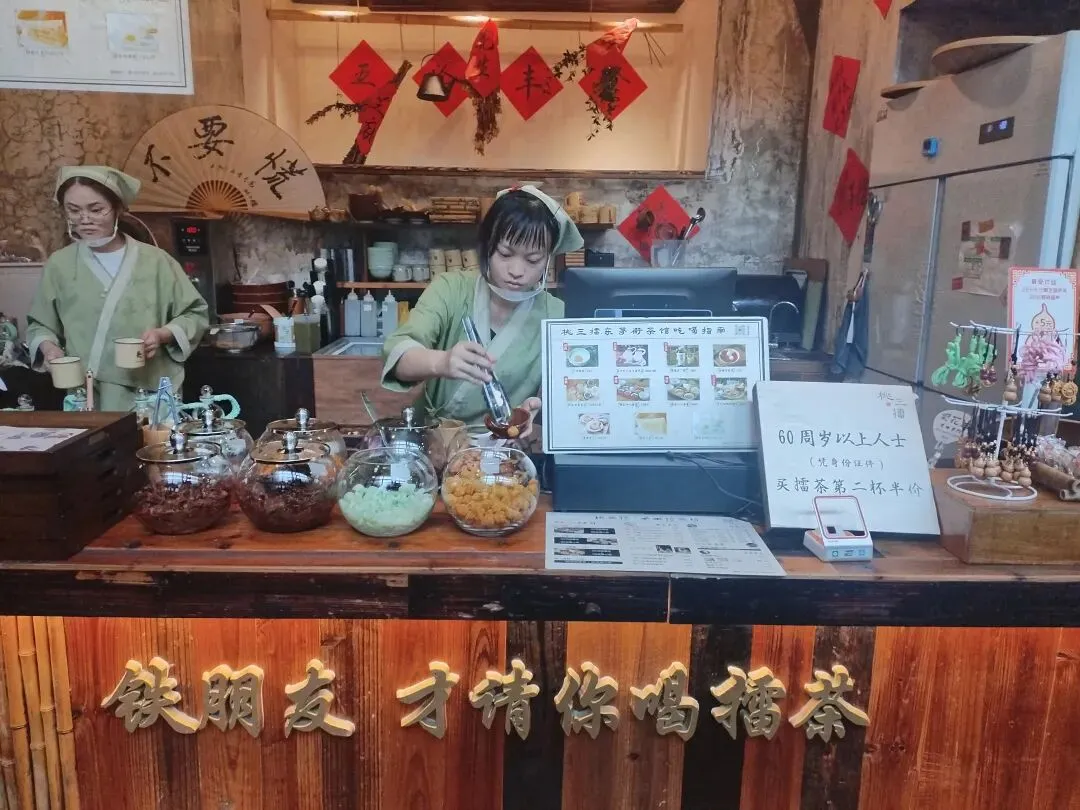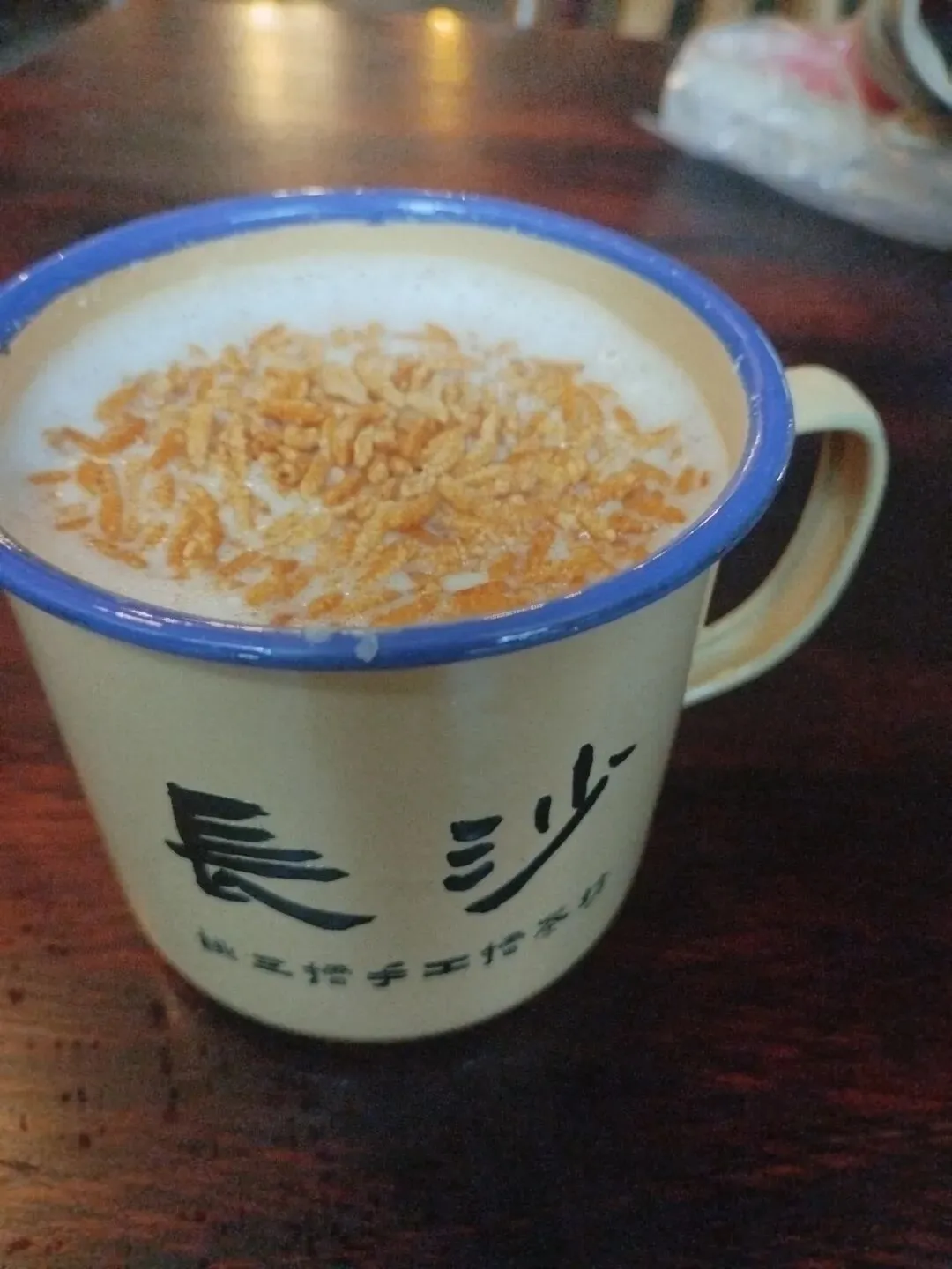 我找了个角落坐下,要了一杯擂茶。茶端上来,炒米、芝麻和花生的香气直往鼻子里钻,喝一口,微微的咸混着姜的辛味,暖意从喉咙一路淌到胃里。墙上那些童谣还在眼前晃——“点点螺螺,虫咬米筛……”旁边一桌老人家打着扑克,时不时冒出几句长沙话,听着格外亲切。