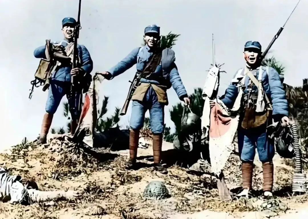 下图为缴获日军武器及防毒面具的中国军队战士