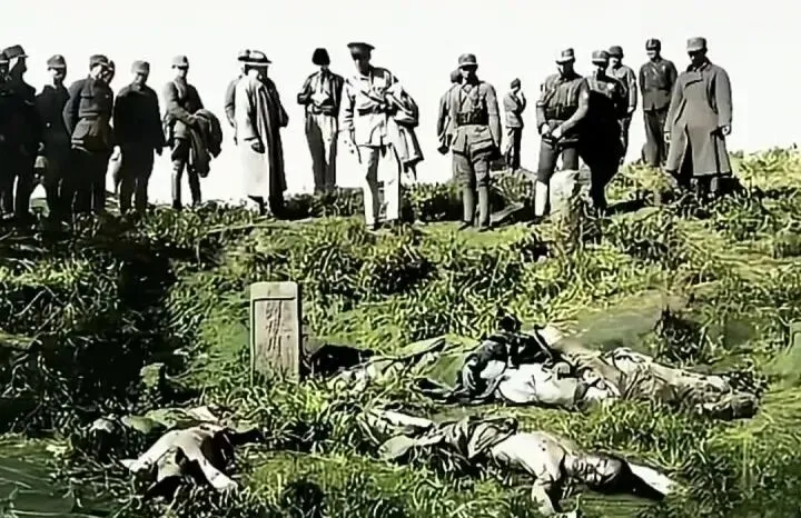 下图为三次长沙会战胜利后盟军代表到战场检阅战斗成果(日军死尸)