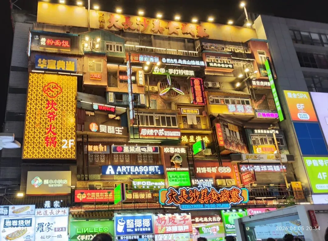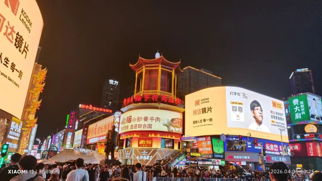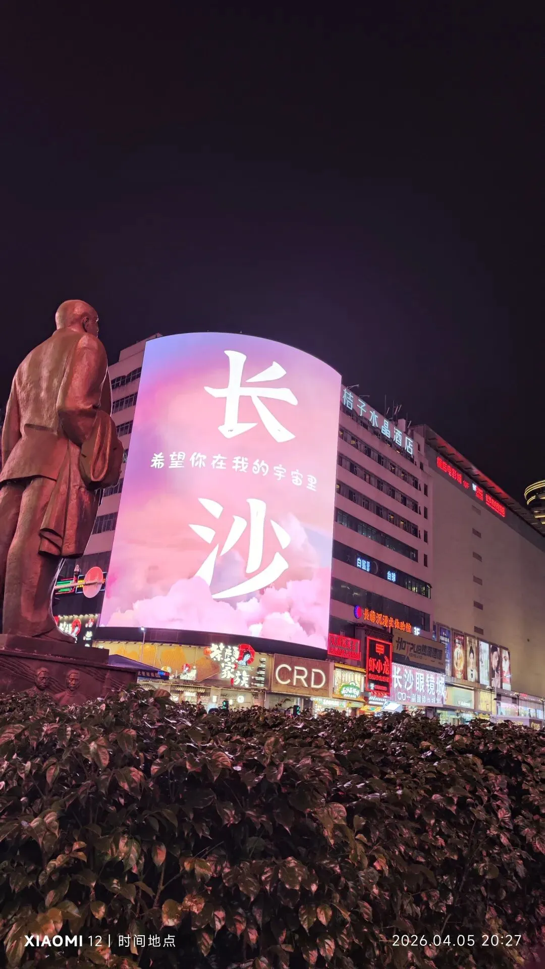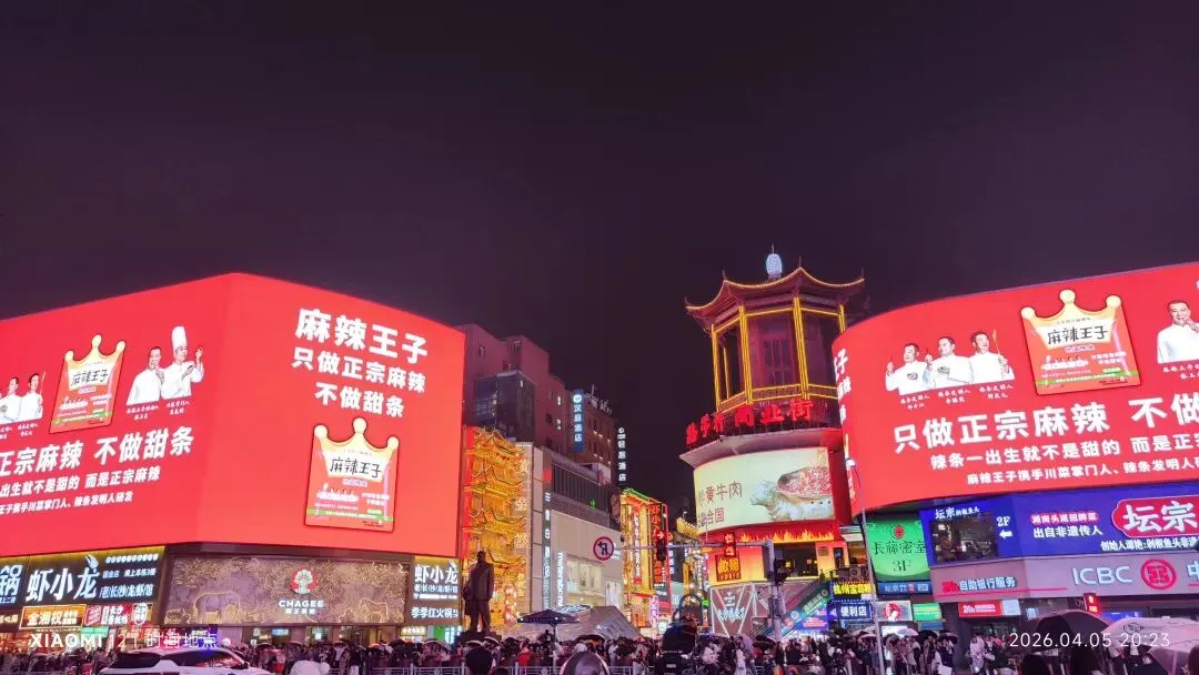 不过,在返回途中,在黄兴雕塑前的十字路口前,我倒是看见了在上海外滩时看见的场面——四面人行道上全是人,正等候着交警的指挥。有些正仰望着路口高楼上不断变换广告的的巨大的广告牌——原来是在等待“长沙”二字拍照打卡。而在另一边的巨大广告牌上,我们熟悉的零食——麻辣王子的广告尤为耀眼。小女在等待过斑马线之余,感慨道:我第一次见识了大城市繁华的样子。