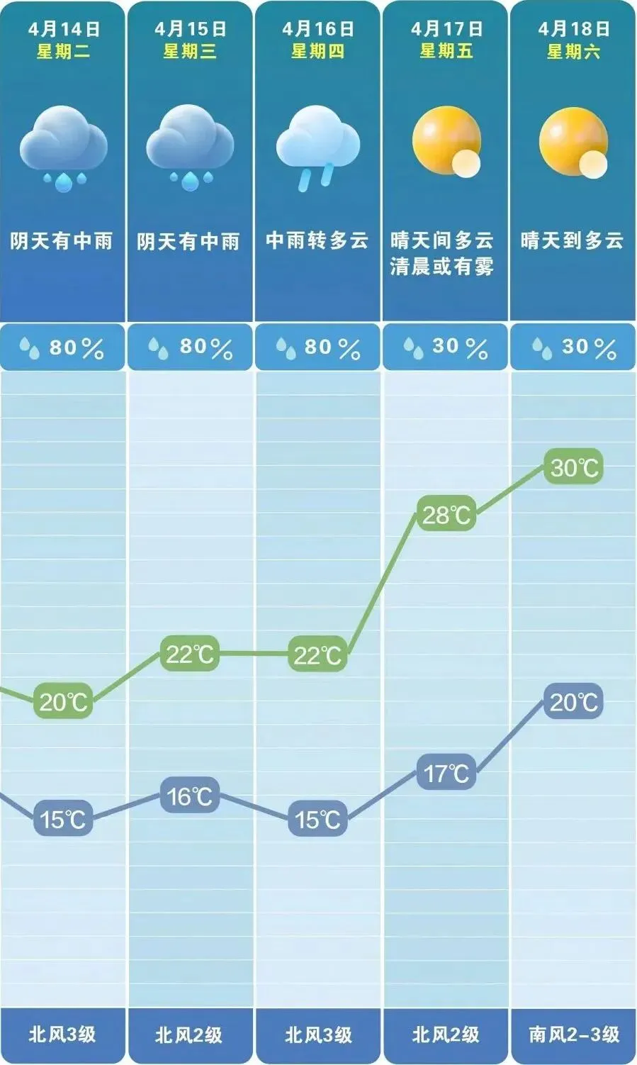 17日,晴天间多云,清晨或有雾,气温快速回升到17℃至28℃;18日,多云间晴天,最高气温将冲到30℃,初夏的暖意再度上线;19日,晴天间多云,气温19℃至28℃,正是出门走走的好时候。