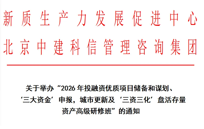 展望2026年,如何充分发挥地方政府专项债券等对重点领域和薄弱环节的投资带动作用,如何积极盘活存量资产、扩大有效融资,如何储备谋划2026年投融资项目,是广泛关注的热点。为了帮助政府部门、中央企业、地方国有企业和金融机构等准确把握当前各项政策导向,学习、交流和探讨当前投融资领域遇到的难点问题并找到应对的措施,新质生产力发展促进中心举办“2026年投融资优质项目储备和谋划、‘三大资金’申报,城市更新及‘三资三化’盘活存量资产高级研修班”,请各单位积极组织,报名参加。