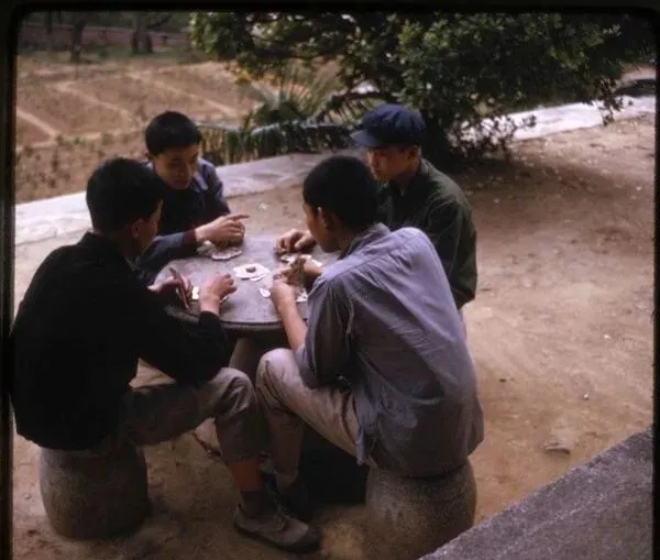 图里这四位正围着小石桌打牌,长沙当年路边石墩、圆桌一摞就能凑出小天地,穿得一个比一个素净,灰得带点蓝,全身上下看不出来啥讲究牌面,也没见谁脸上着急,动作倒是流畅,手里摸着牌,脚底下不安分,有的撅着身子,有的眯着眼,灰衣少年、石墩子、扑克牌——三样拼一起,就出来了当年的长沙气小时候家门口也有这等场面,夏天晚饭后,大人小孩陈谷子烂芝麻全往桌上一搁,分什么大人小孩,输赢没人在意,手气好大家笑,手气差自嘲两句,日子就过去了,现在这场景少了,取而代之的是手机和网络,牌桌上的烟火气也逐渐淡了下去。