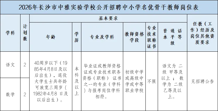 严格按照《2026年长沙市雨花区公开招聘中小学名优骨干教师公告》执行,具体年龄、学历、资历、教师资格等要求与程序详见雨花区官方公告。(请点击“阅读原文”查看公告)