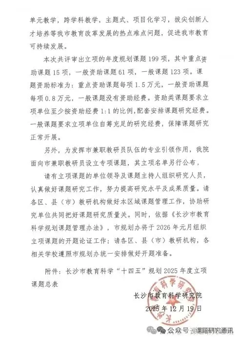 请有立项课题的单位领导及课题主持人组织研究人员,认真做好课题研究工作,努力提高研究水平及成果质量。请各区、县(市)教研机构做好本区域课题管理工作,协助研究单位共同把好课题研究质量关。同时,依据《长沙市教育科学规划课题管理办法》,市规划办将于2026年元月组织立项课题的开题论证工作;请各区、县(市)教研机构,各相关学校遵照市规划办统一安排做好开题准备。