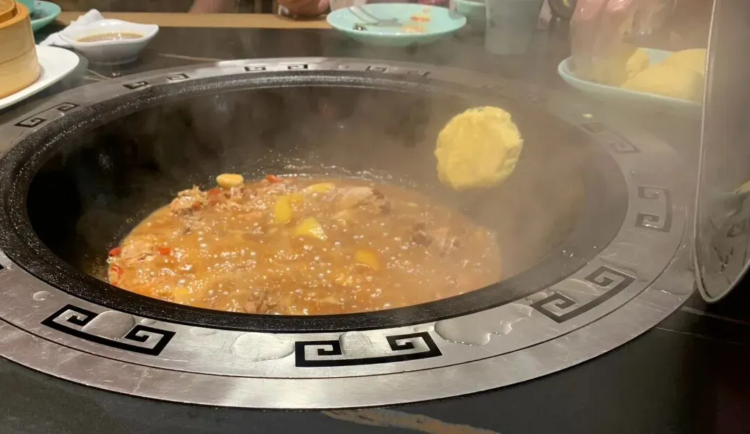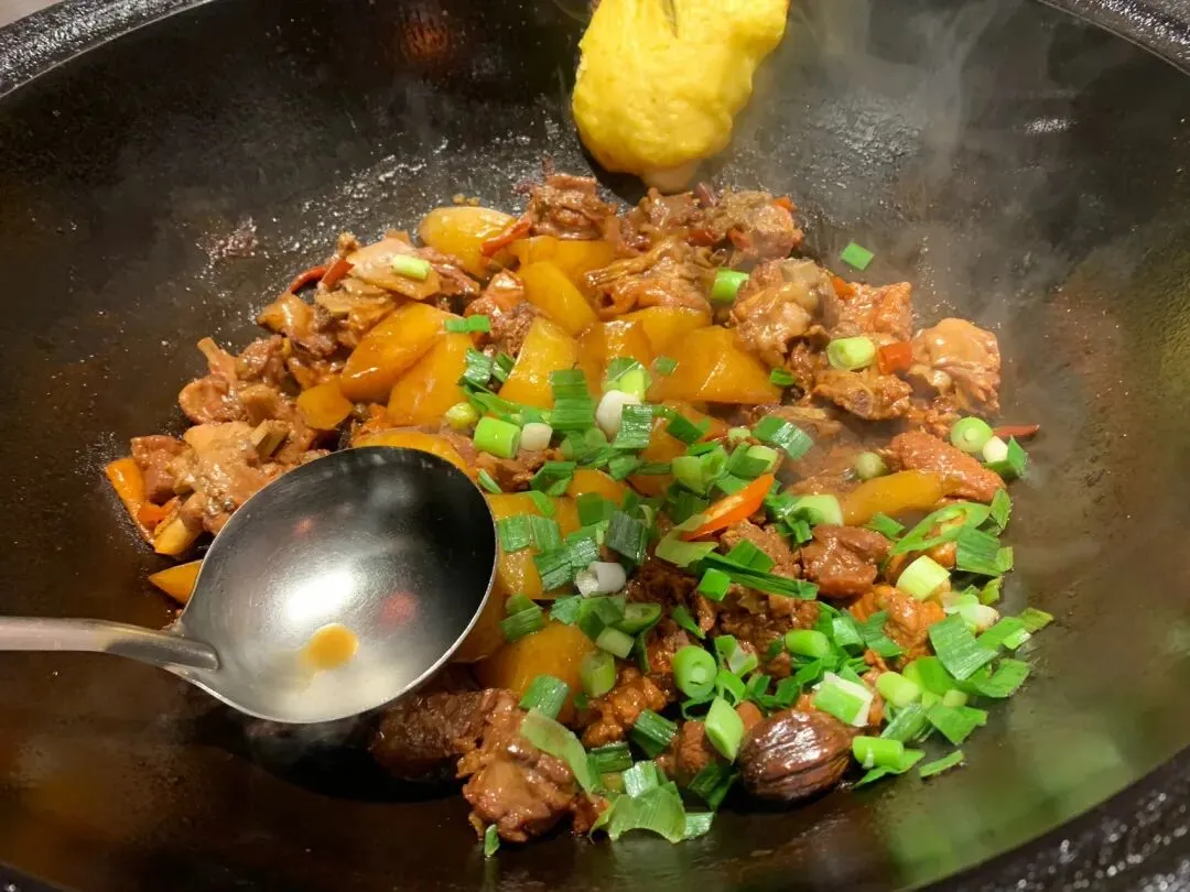 铁锅炖的鸡肉、排骨都挺好吃,又香又入味。