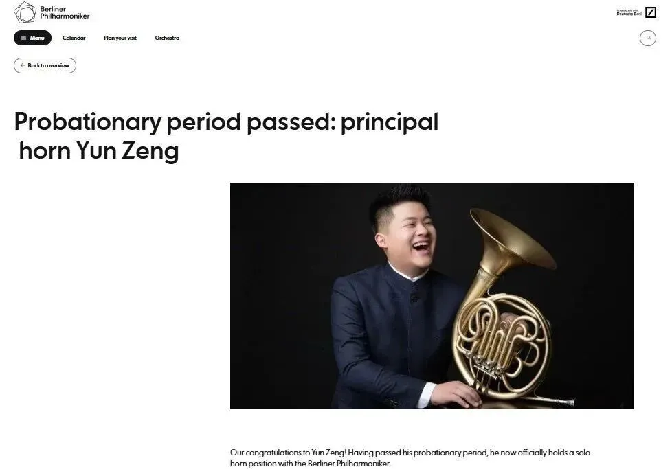 2025年6月,柏林爱乐乐团官方公布,中国青年圆号演奏家曾韵自2023年成功考入乐团后,已通过乐团的试用期,正式成为柏林爱乐乐团圆号首席。