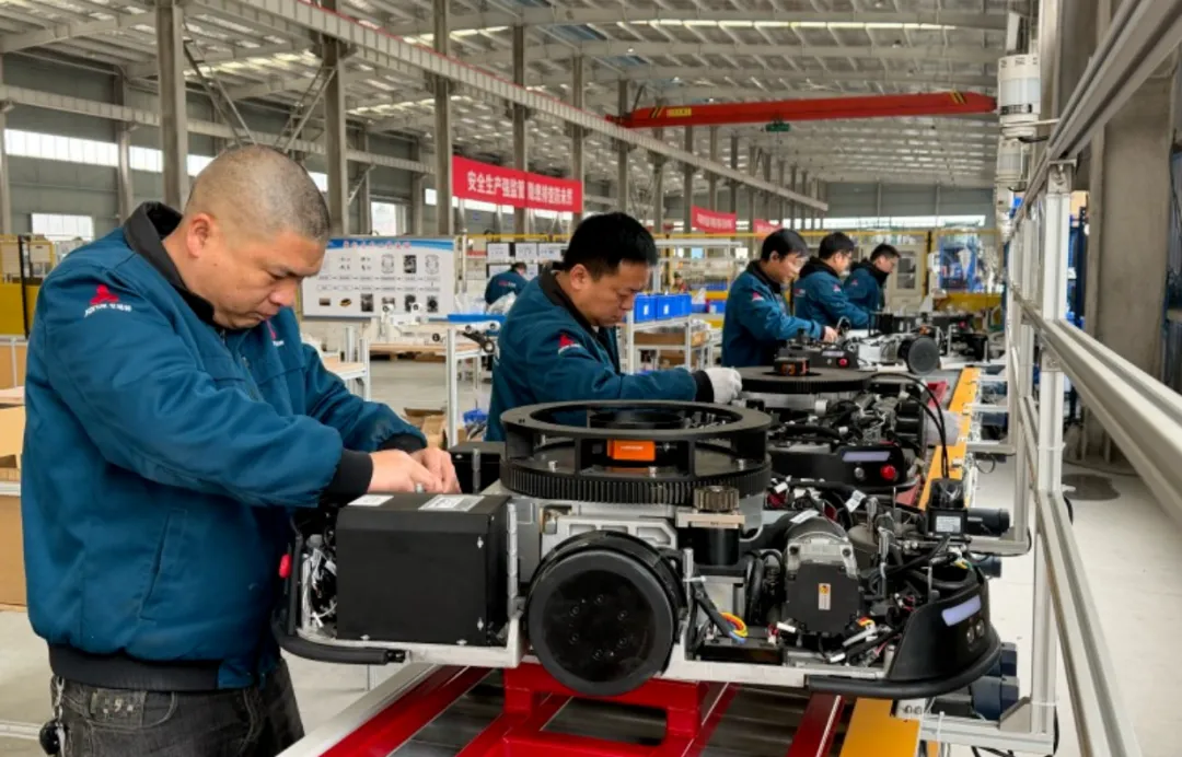 艾博特生产车间内,工人正在组装调试自主移动机器人。