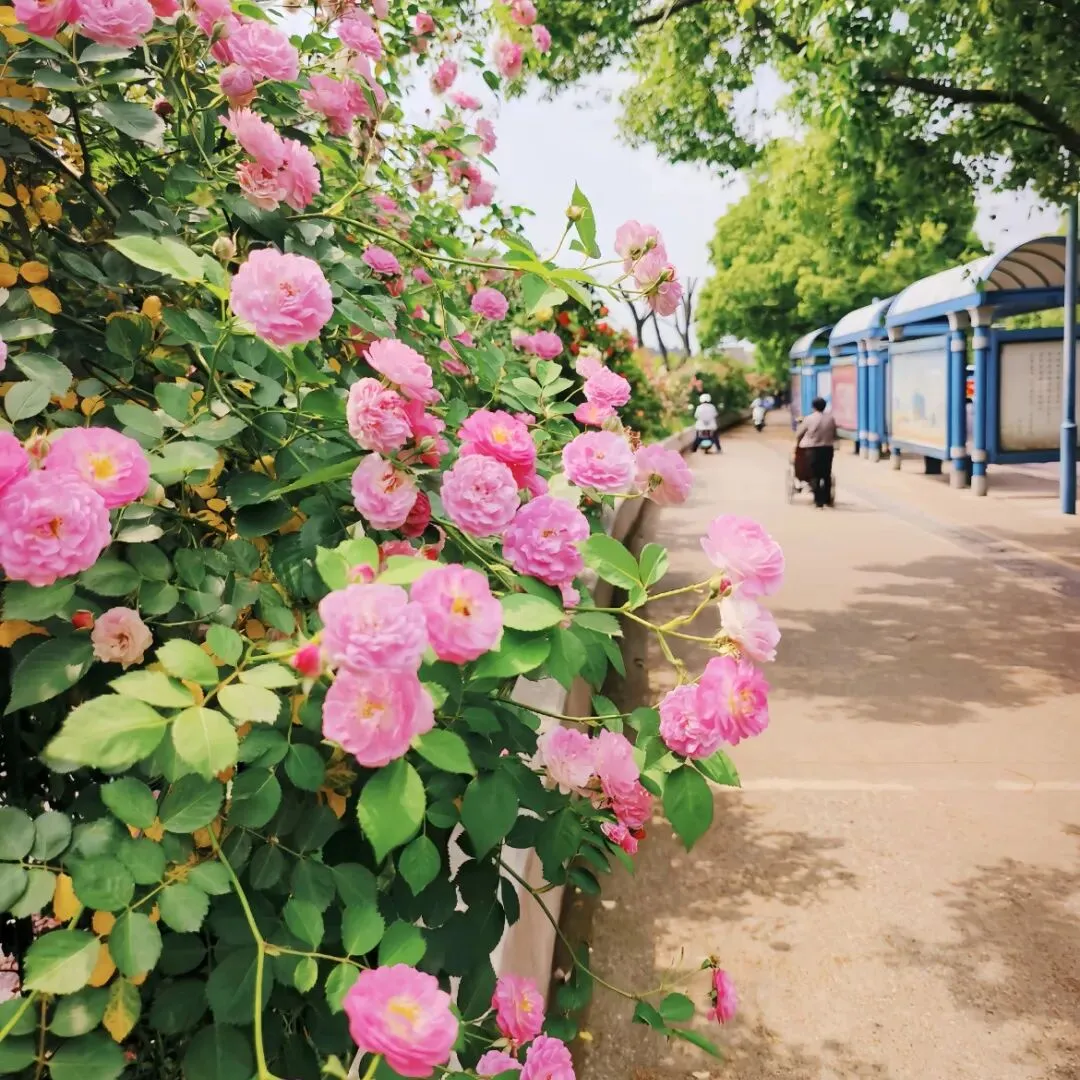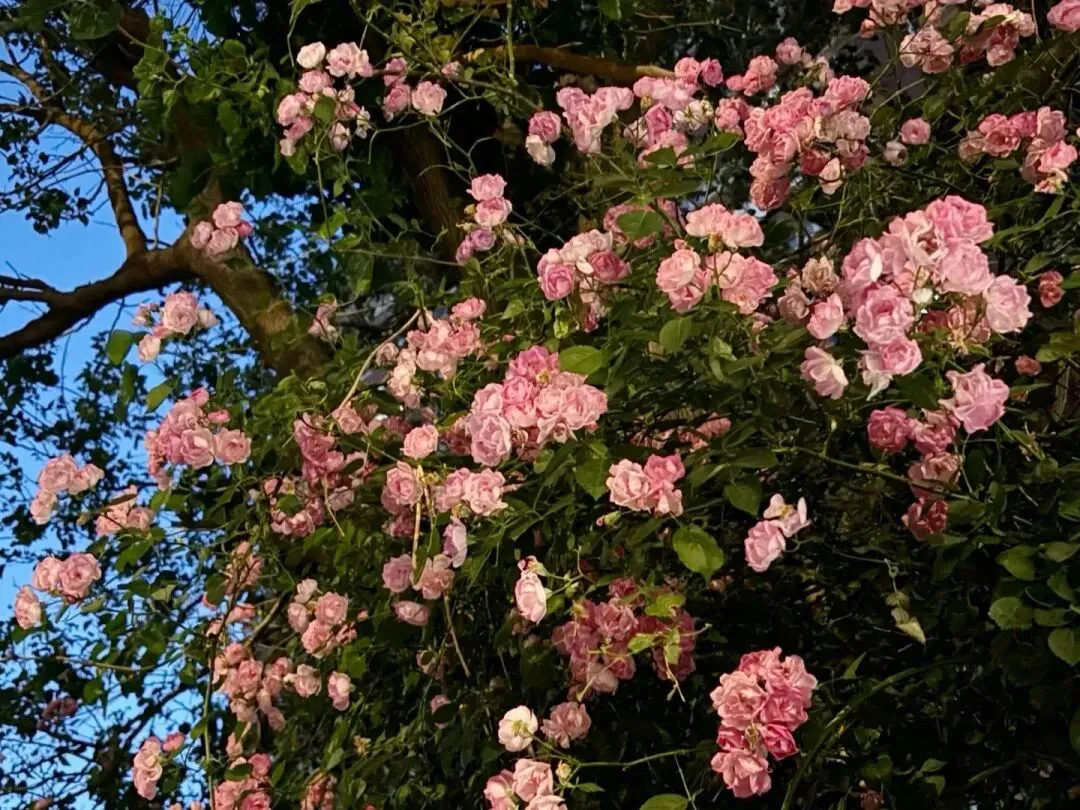 粉白、淡粉的蔷薇花,垂落在墙头、围栏上,风一吹轻轻摇曳,像一首温柔的诗,拍照超出片,随手一拍都是春日氛围感~