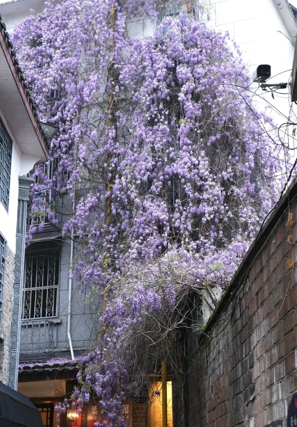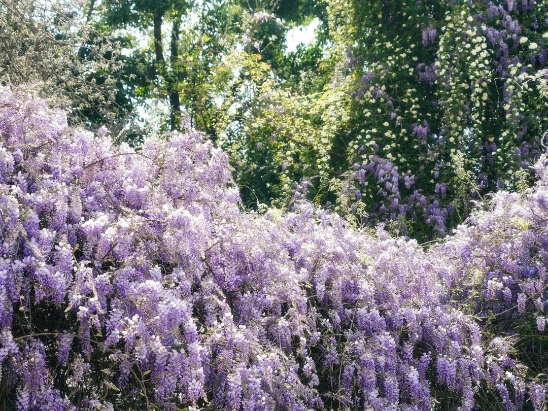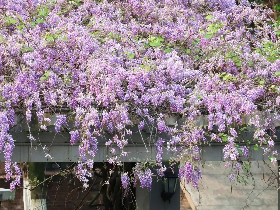 一串串紫藤萝垂挂枝头,淡紫色的花穗像瀑布一样倾泻而下,风一吹,仿佛万千紫蝶飞舞,搭配古色建筑,氛围感直接拉满,特别适合拍照留念。