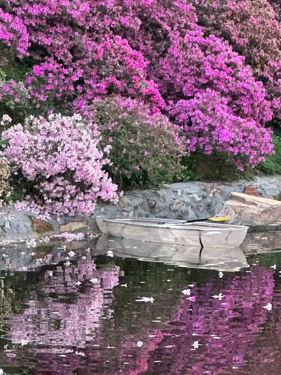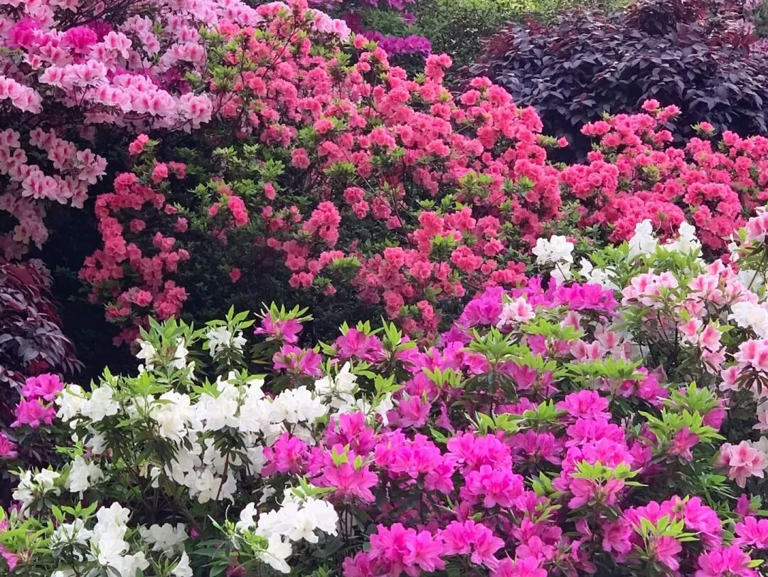 2.晚安家居文化园:各色杜鹃沿径舒展,山腰花团锦簇,湖畔还有花瓣映水的美景,步步皆景。